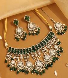 | Product Description | Make A Majestic Statement With This Heavy Kundan Choker, Featuring Oversized Emerald Cut Stones And Pear Shaped Drops. Accompanied By Matching Heavy Earrings And A Maang Tikka, This Set Is Embellished With Delicate Pearls And Green Beads. It Is A Quintessential Bridal Accessory That Exudes Luxury And Royal Vintage Charm. |
