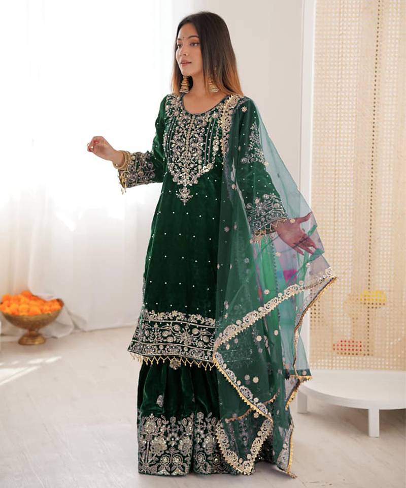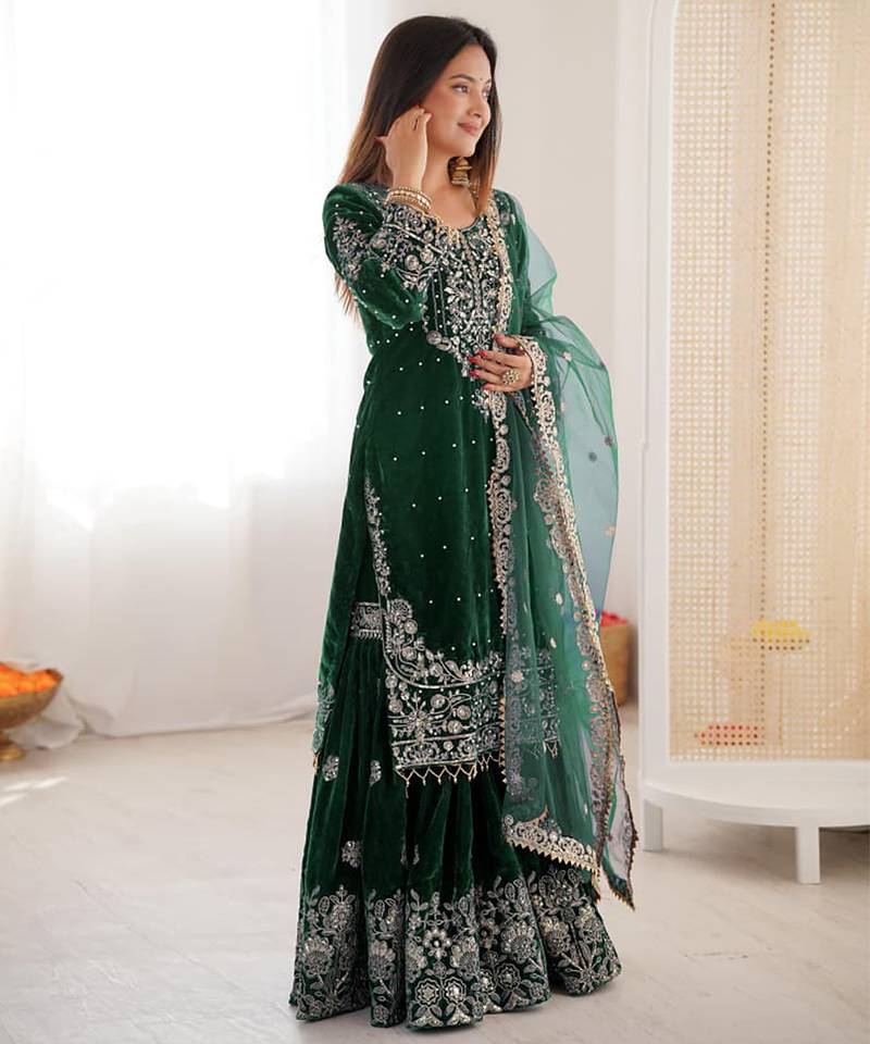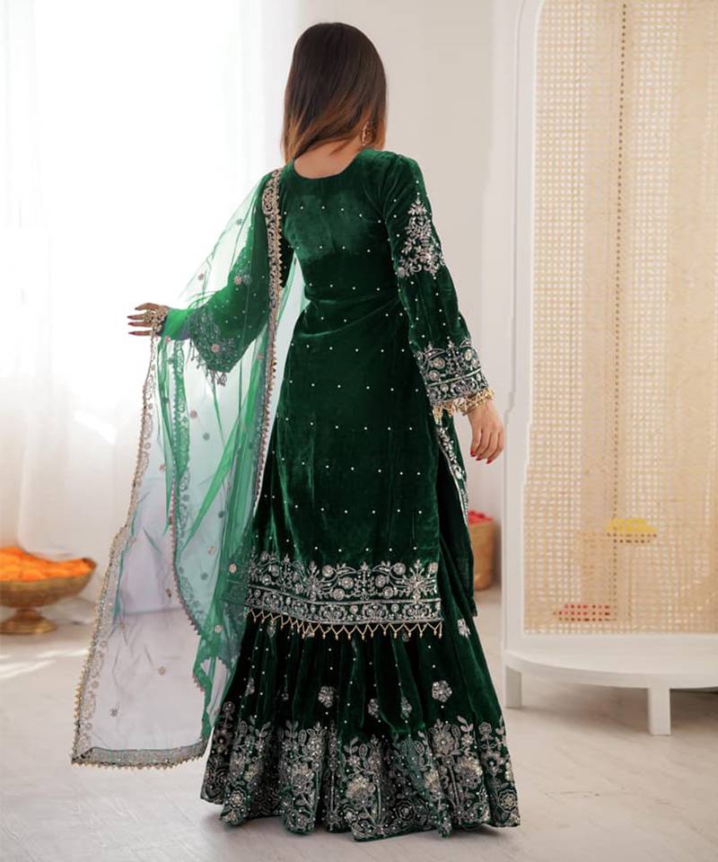 Green velvet sharara set with thread and sequence work stitched