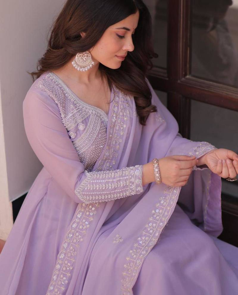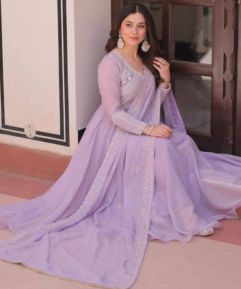| Product Description | Radiate Soft Elegance With This Floor Length Lavender Anarkali. Crafted From Premium Georgette, The Bodice Is Adorned With Delicate Tone On Tone Pearl And Thread Embroidery. The Voluminous Flare And Sheer Matching Dupatta Create A Graceful, Feminine Aesthetic Perfect For Daytime Events, Formal Receptions, Or Sophisticated Festive Gatherings. |