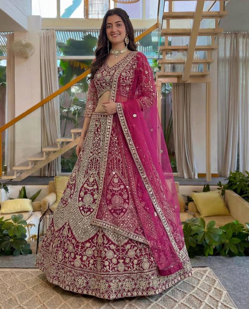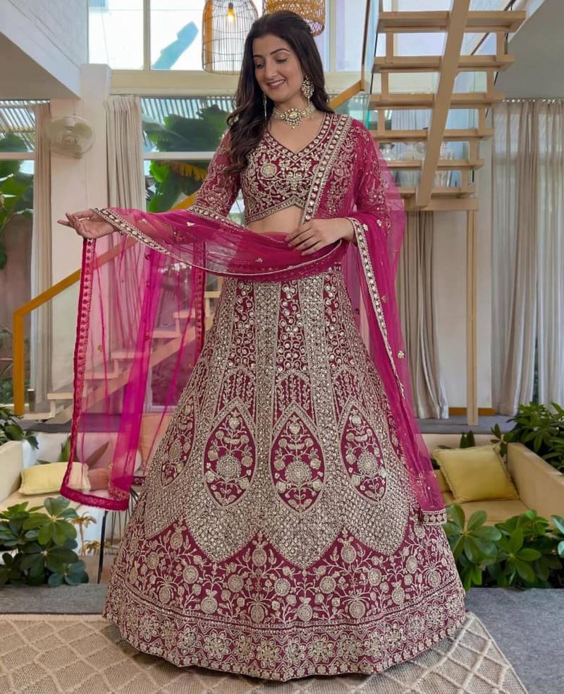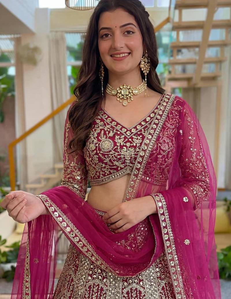 Magenta net embroidered lehenga set