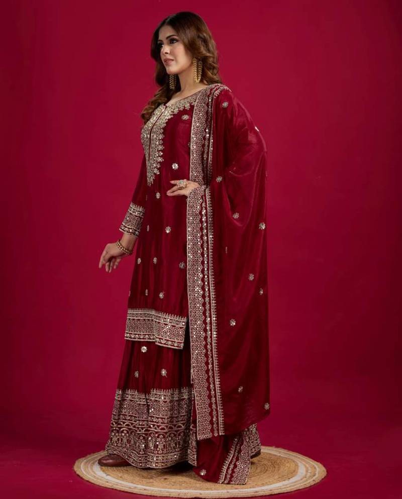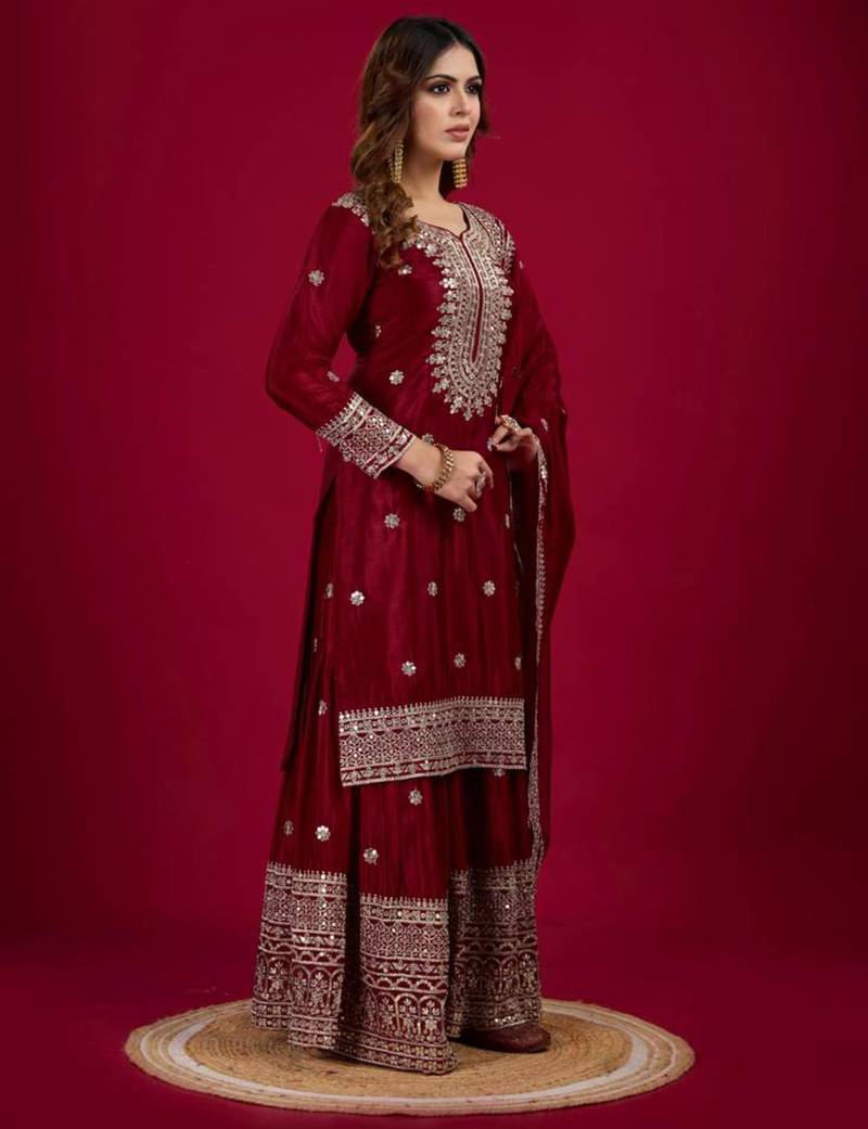 Maroon art silk embroidered sharara set stitched