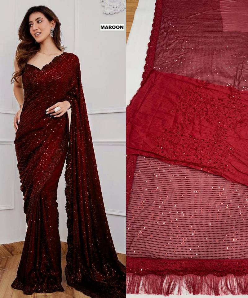 | Product Description | Radiate Opulence In This Deep Maroon Sequin Saree. The Rich, Jewel Toned Fabric Is Meticulously Embellished With Tonal Sequins That Catch The Light From Every Angle. Perfect For Wedding Receptions And Formal Galas, Its Breathable Georgette Construction Ensures Comfort Without Compromising On Its High Fashion, High Shine Editorial Appeal. |