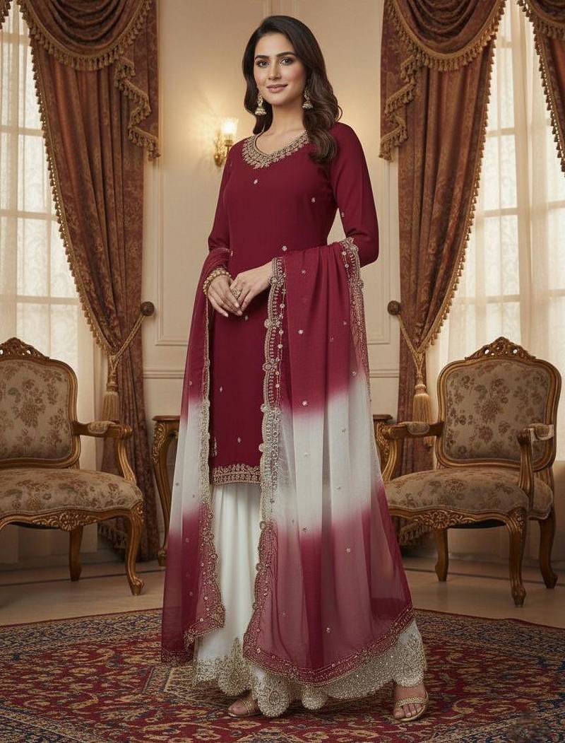 | Product Description | Step Into Timeless Elegance With This Maroon Kurta Set Paired With A White Sharara And Embroidered Dupatta. Crafted With Fine Detailing And Lightweight Fabric, It Ensures Comfort And Style. Ideal For Festive Occasions, Weddings, And Cultural Events With A Rich, Graceful Look. |