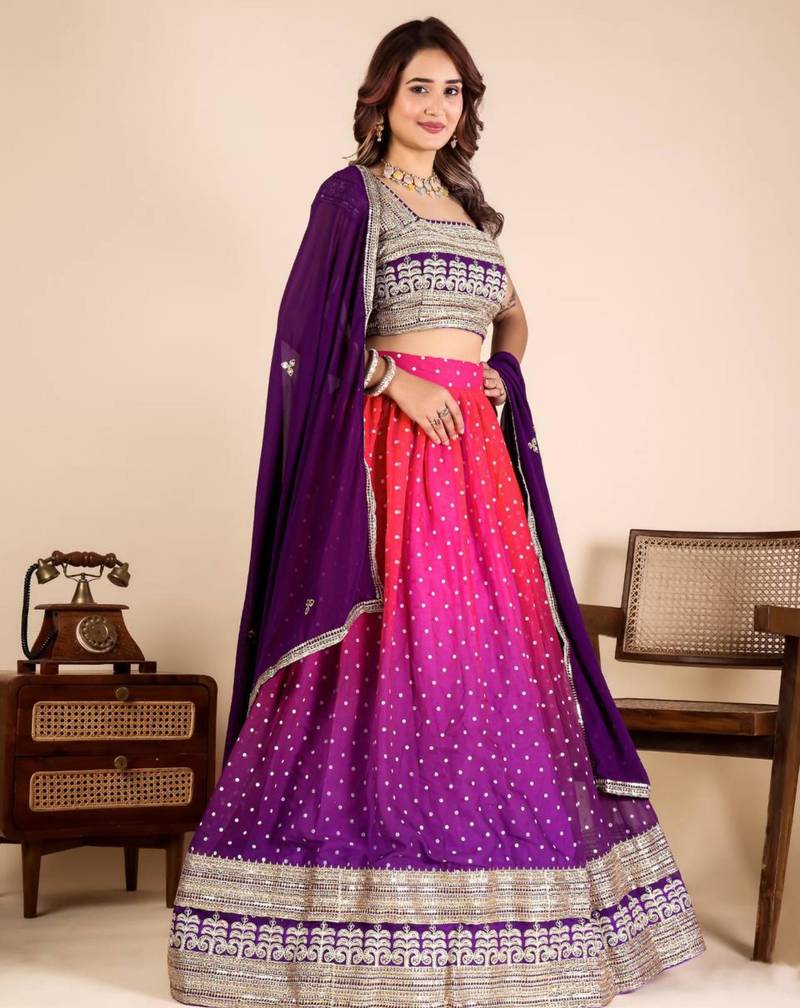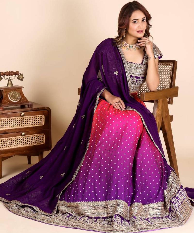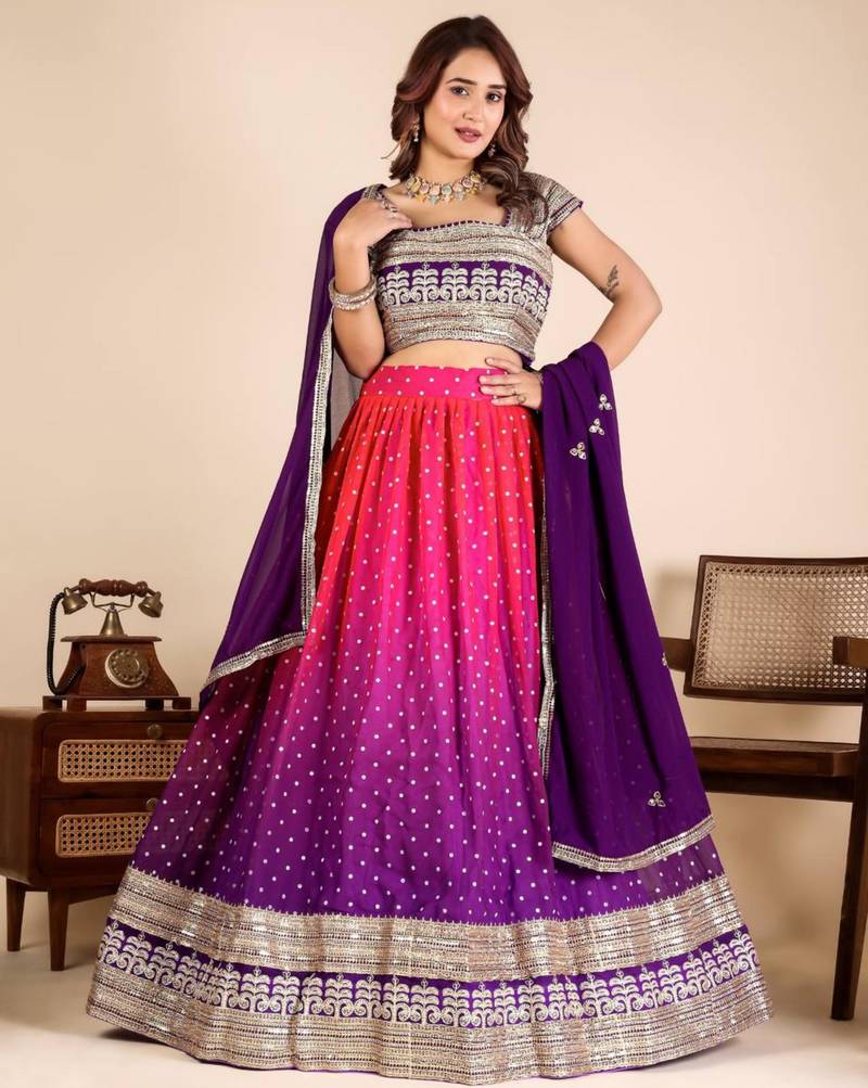 | Product Description | Glow With Modern Sophistication In This Pink And Purple Ombré Lehenga. Adorned With Delicate Silver "Butti" Sequins And A Heavy Architectural Border, The Skirt Creates A Stunning Visual Gradient. Paired With A Matching Deep Purple Dupatta And A Silver Embroidered Blouse, It’s A Premier Choice For Festive Evening Receptions. |