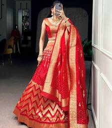 | Product Description | Radiate Timeless Elegance In This Multicolor Banarasi Lehenga. The Unique Skirt Features A Bold Gold Zari Zig Zag Pattern, Beautifully Complemented By A Classic "Butti" Work Blouse And A Heavily Bordered Dupatta. This Regal, High Contrast Set Is An Ideal Choice For Brides And Family Members Seeking A Traditional Yet Striking Look. |