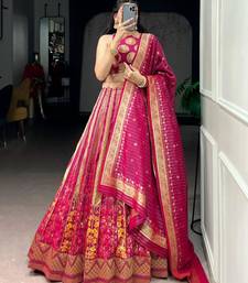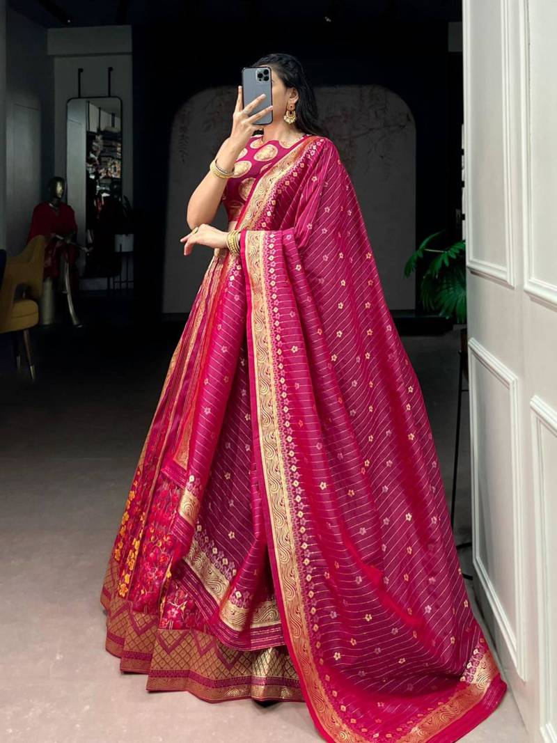 | Product Description | Make A Grand Statement In This Multicolor Banarasi Silk Lehenga, Featuring A Sleeveless Blouse With Traditional Gold Coin Motifs. The Voluminous Skirt Is Adorned With Intricate Floral Weaving And A Broad Geometric Gold Border. Paired With A Matching Striped Dupatta, This Ensemble Is Perfect For Weddings And High End Cultural Celebrations. |