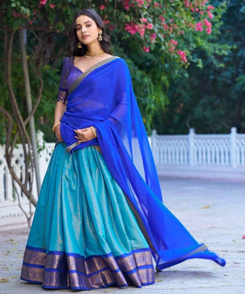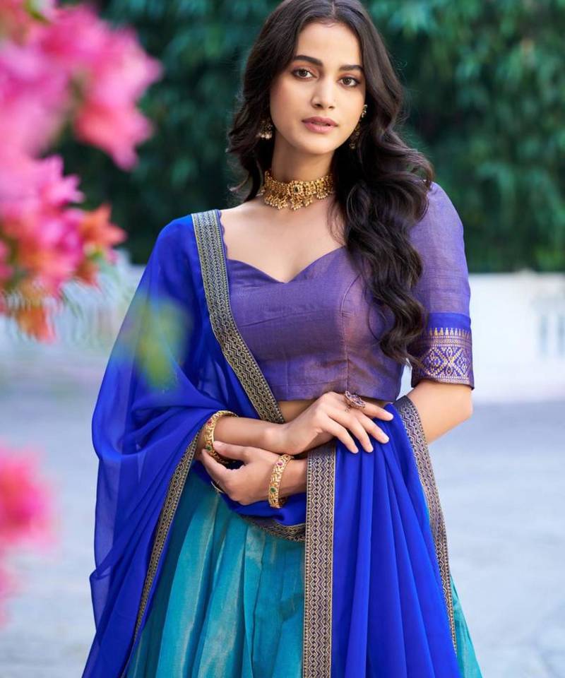 | Product Description | Capture The Serenity Of The Ocean In This Multicolor Silk Lehenga. The Dual Toned Blue Ensemble Is Highlighted By A Majestic Gold Weave Border And Traditional Pattu Style Craftsmanship. Perfect For The Modern Woman Who Appreciates Classic Luxury, This High Quality Set Is A Timeless Addition To Any Festive Wardrobe. |