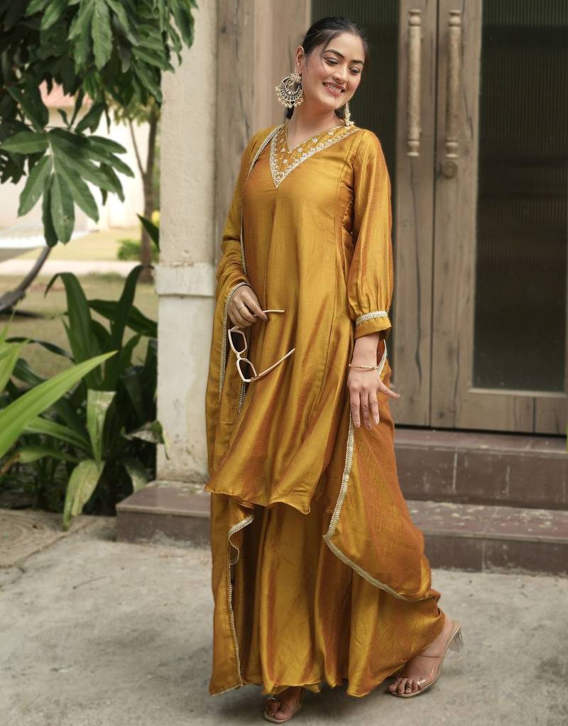 | Product Description | Add Warmth To Your Wardrobe With This Mustard Kurta Palazzo Set Featuring Delicate Neckline Embroidery And A Matching Dupatta. Designed With Premium Fabric, It Ensures Comfort And Style. Perfect For Festive Occasions Or Daytime Events, This Outfit Combines Rich Color With Minimal Elegance. |