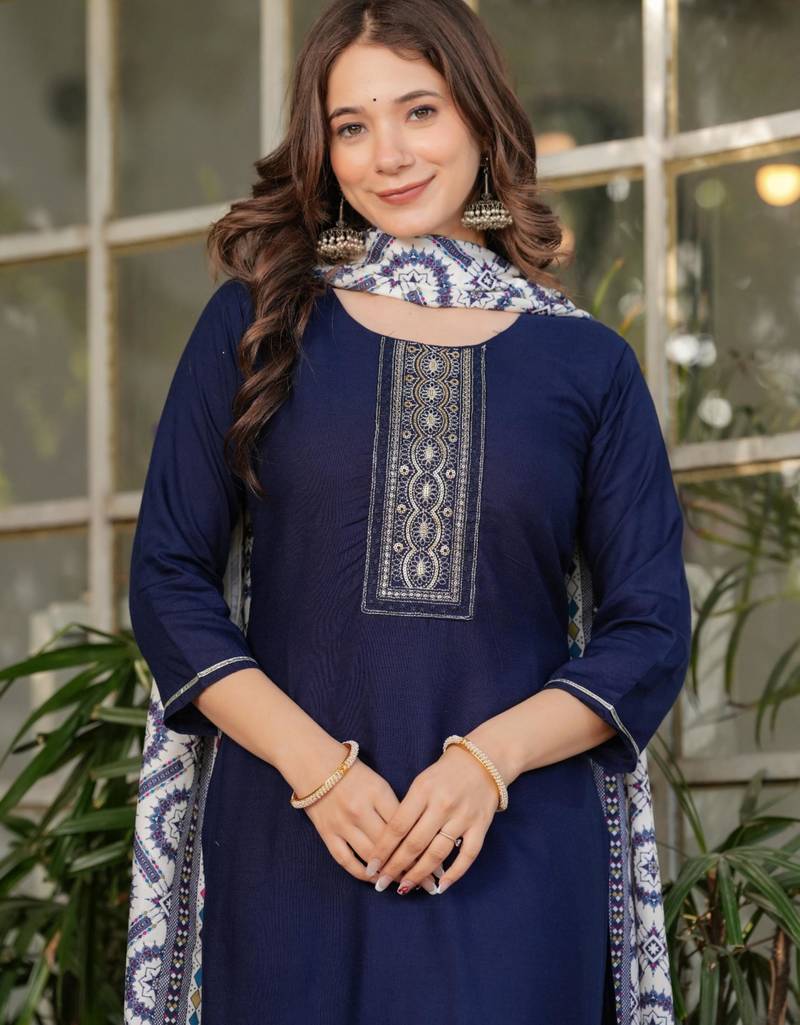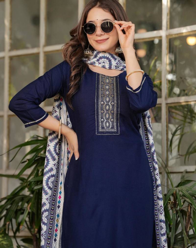 | Product Description | Command Attention In This Sophisticated Navy Blue Silk Suit. The Focal Point Is A Beautifully Crafted Neckline Panel Featuring Intricate Silver And Gold Threadwork. This Timeless Ensemble Includes A Matching Printed Dupatta And Streamlined Trousers, Providing A Regal Look That Is Ideal For Formal Gatherings And Cultural Events. |
