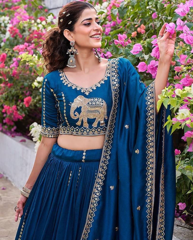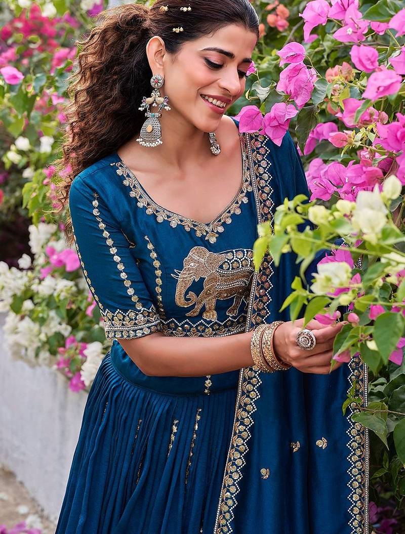 | Product Description | Celebrate Indian Heritage With This Deep Blue Silk Lehenga. The Centerpiece Is The Exquisite Golden Elephant Motif Embroidered On The Blouse, Symbolizing Strength And Royalty. Paired With A Pleated Skirt And An Elegantly Bordered Dupatta, This Outfit Is A Timeless Choice For Cultural Events And Traditional Weddings. Free Size Upto 44 |