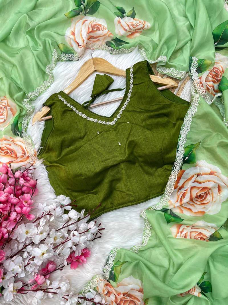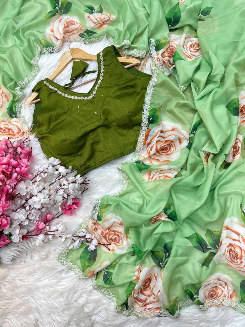 | Product Description | Exude Romantic Sophistication In This Enchanting Mint Green Sheer Saree, Beautifully Adorned With Oversized Vintage Rose Prints. Delicately Accented By A Refined Pearl Embellished Scalloped Border, This Lightweight Chiffon Drape Delivers A Perfectly Ethereal Aesthetic. Ideal For Garden Weddings Or Upscale Brunches, It Embodies Graceful Femininity And Modern Elegance. |