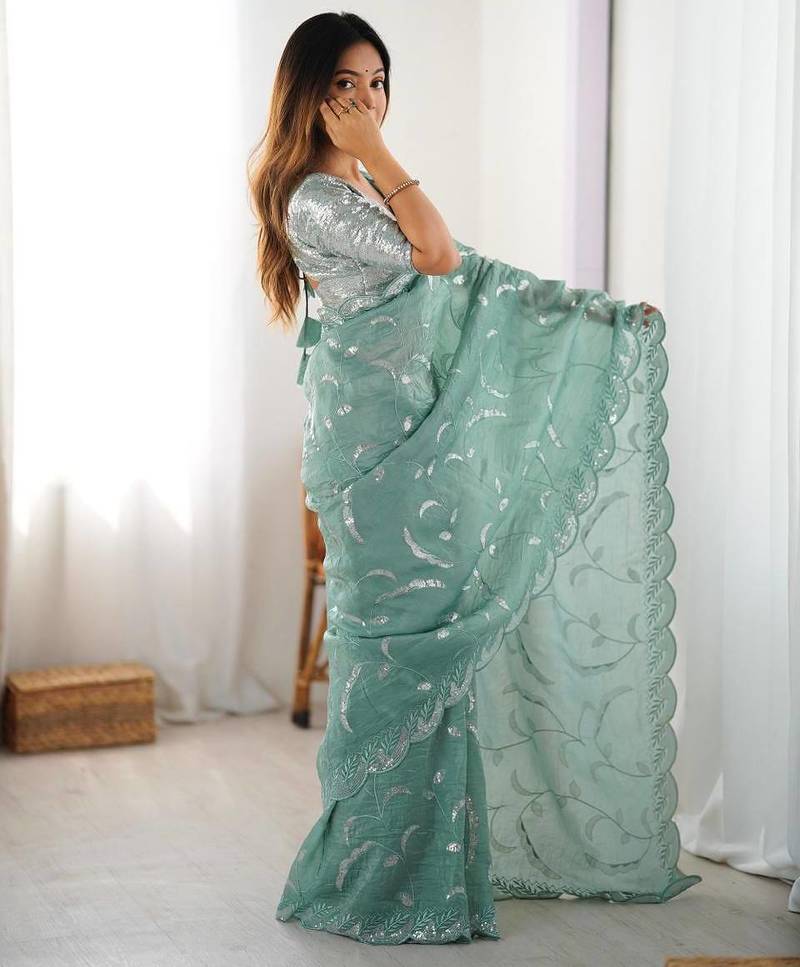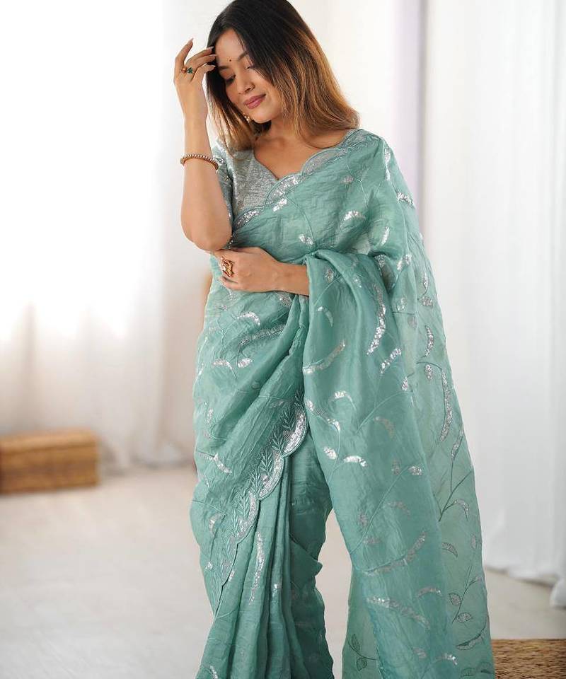 | Product Description | Beautiful Pastel Green Saree Paired With A Heavily Embroidered Statement Blouse. Designed For Modern Elegance, It Features Intricate Detailing And A Soft Drape. Perfect For Weddings, Parties, And Festive Occasions, This Saree Blends Contemporary Style With Traditional Craftsmanship. |