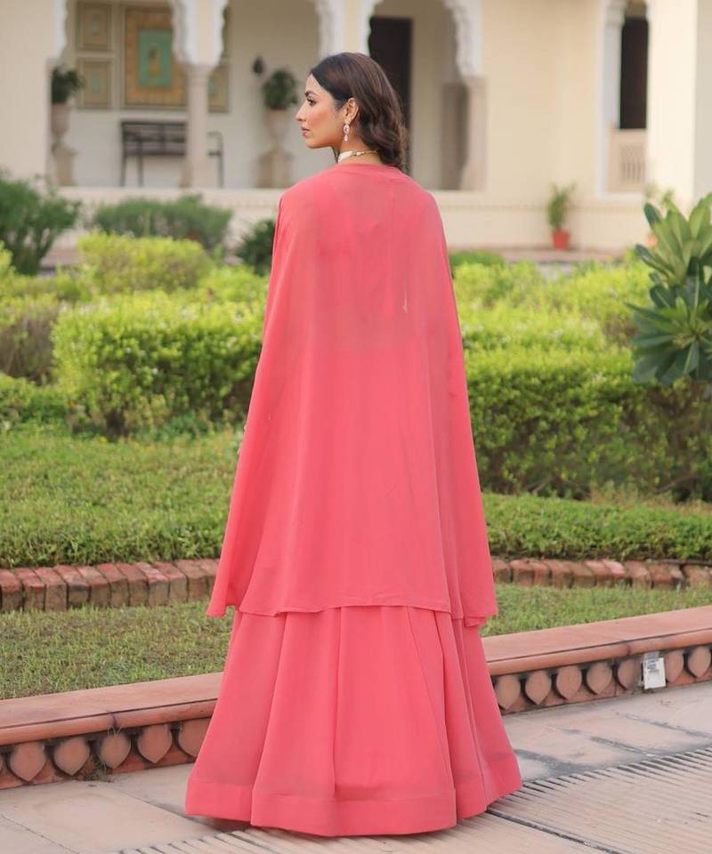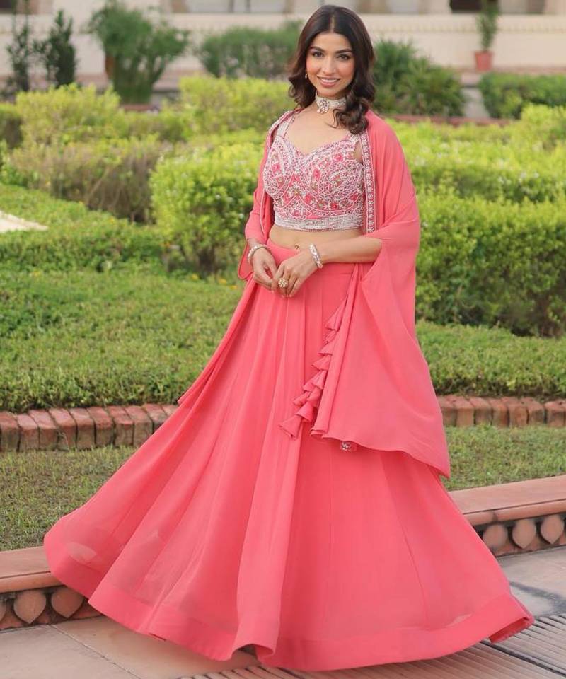 | Product Description | Exude Soft Charm In This Peach Georgette Plain Lehenga. The Lightweight A Line Skirt Is Paired With A Sleeveless Sweetheart Neck Choli Featuring Intricate Thread Embroidery And Beads. Completed By A Matching Peach Georgette Shrug With A Gota Border, This Ensemble Offers A Breezy, Contemporary Look Perfect For Festive Daytime Ceremonies. |