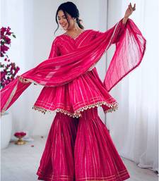 | Product Description | Dazzle In Our Hot Pink Sharara Set, A Vibrant Masterpiece Featuring A Peplum Style Short Kurta With Shimmering Gold Vertical Stripes. The Flared Sharara Pants And Matching Dupatta Are Finished With Artisanal Mirror Work Tassels Along The Borders. This Breathable Ensemble Is The Perfect High Energy Choice For Weddings, Sangeets, Or Festive Celebrations. |