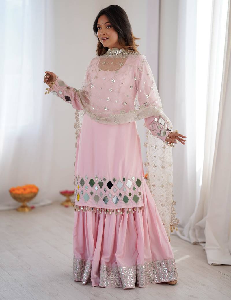 Pink mirror work sharara set with sheer embellished dupatta stitched