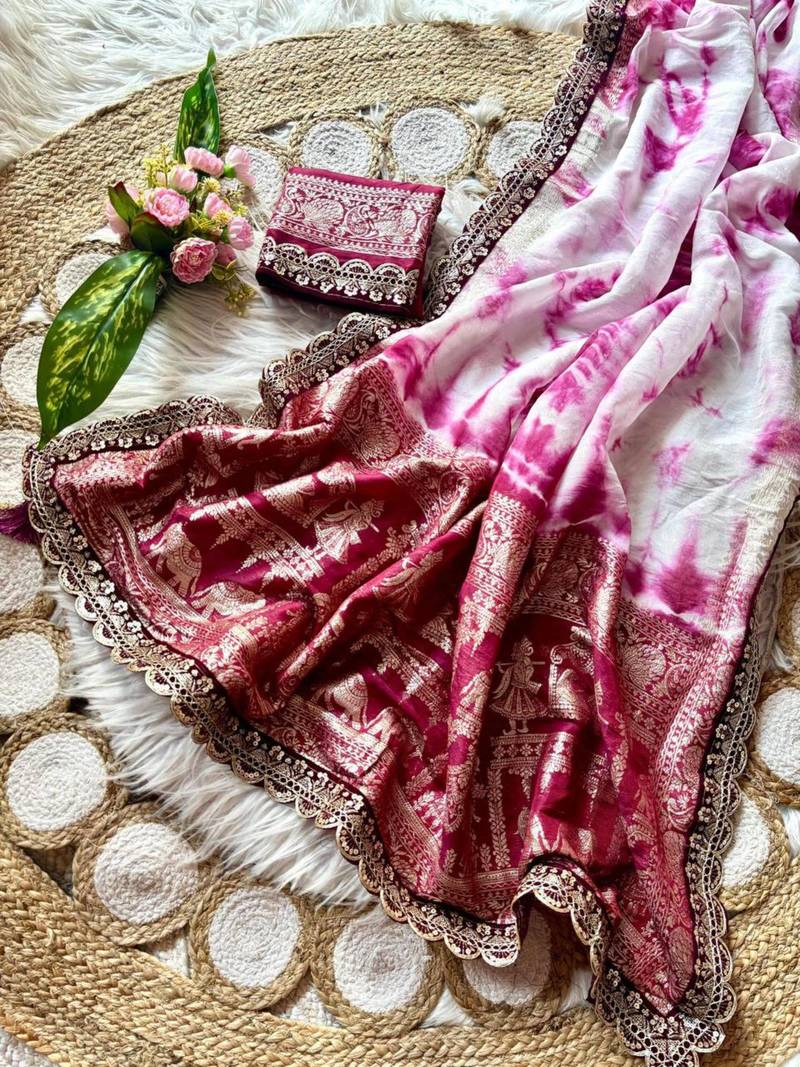 | Product Description | Make A Captivating Statement With This Exquisite Pink And White Shibori Tie Dye Saree. Framed By A Heavily Ornate, Traditional Zari Border, This Stunning Garment Brilliantly Juxtaposes Modern Dyeing Techniques With Heritage Craftsmanship. Its Lightweight, Flowing Silhouette Guarantees Effortless Grace And Sophisticated Style For Your Upcoming Festive Gatherings. |