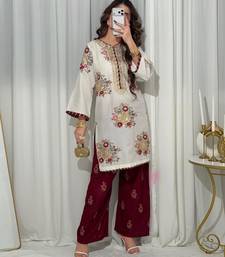 | Product Description | This Sophisticated Co Ord Set Features A Pristine White Tunic Adorned With Multi Colored Floral Medallions And Golden Tilla Embroidery. The Deep Maroon Contrast On The Neckline And Sleeve Borders Coordinates Perfectly With The Embroidered Tapered Trousers. It Is A Refined, Structured Ensemble That Balances Professional Poise With Traditional Artisanal Elegance. |