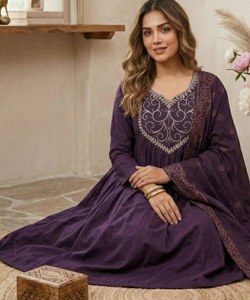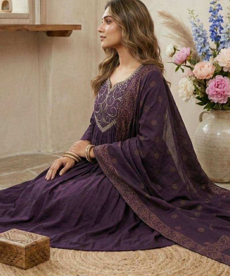 | Product Description | Discover Regal Charm In This Purple Silk Blend Anarkali Suit. The Silhouette Features A Gracefully Pleated Bodice Adorned With Intricate Silver Toned Embroidery At The Neckline. Paired With A Matching Dupatta Featuring Traditional Block Print Inspired Borders, This Ensemble Combines Classic Craftsmanship With Modern Comfort For A Truly Distinguished Look. |