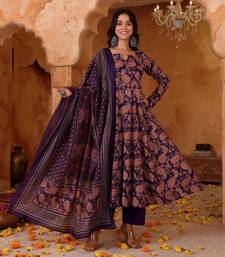 | Product Description | Make A Bold Statement In This Deep Purple Anarkali. Featuring An All Over Traditional Paisley Print In Warm Ochre Tones, The Kurta Is Designed With A Modern Square Neckline And Long Sleeves. Complete With Matching Wide Leg Trousers And A Printed Dupatta, This Ensemble Offers A Perfect Blend Of Heritage And Contemporary Fashion. |