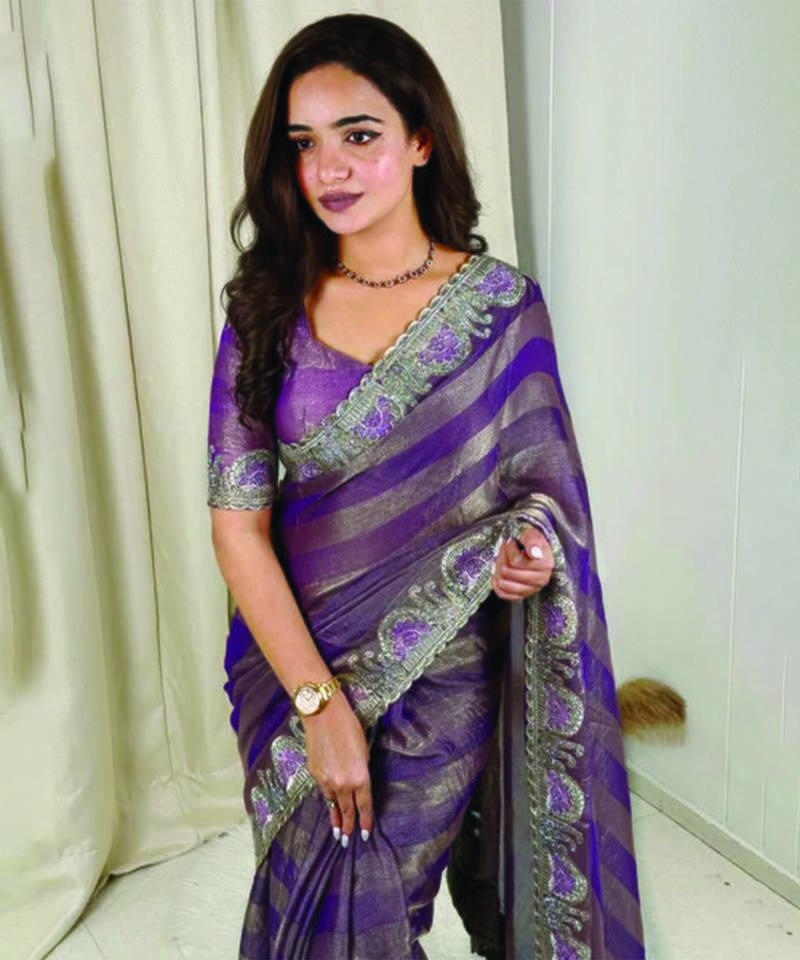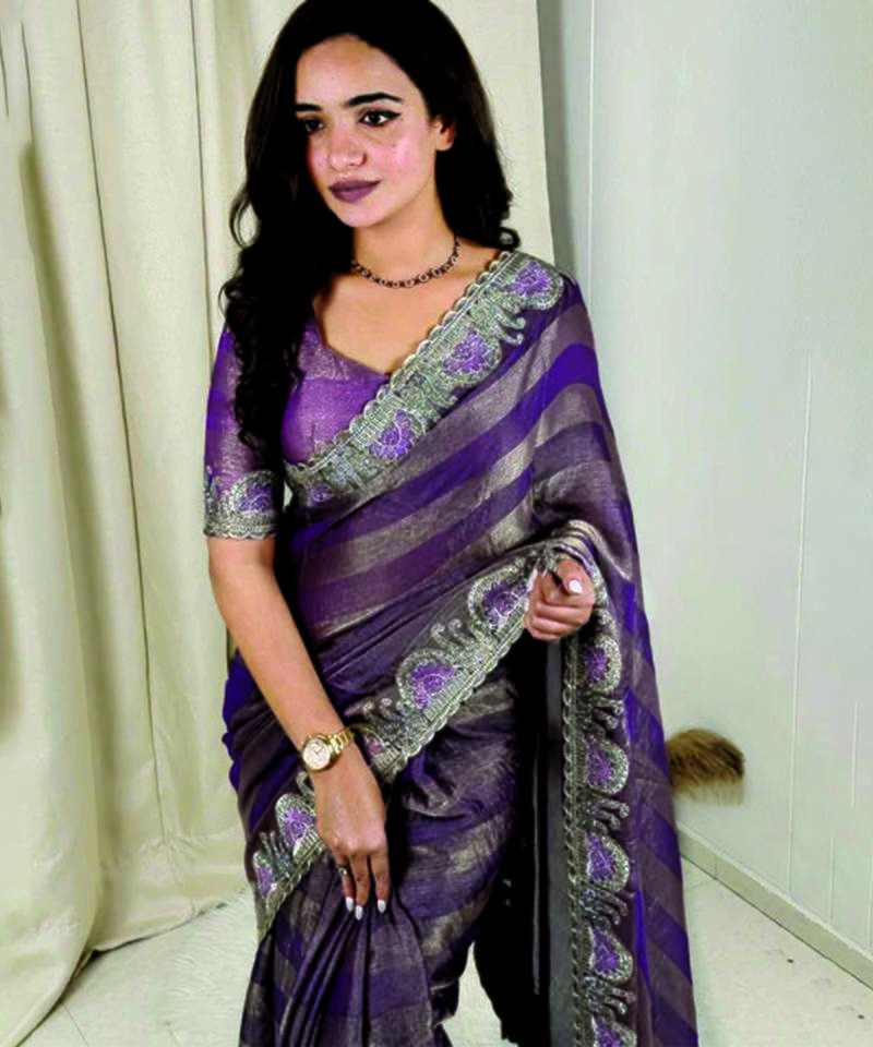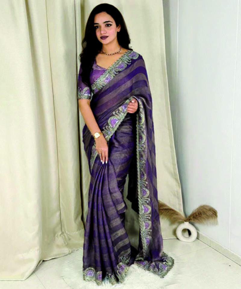 | Product Description | This Purple Saree Showcases Subtle Stripes And An Ornate Embroidered Border For A Unique Finish. Designed For Comfort And Style, It Drapes Beautifully And Enhances Your Silhouette. Ideal For Festive Wear, This Saree Combines Modern Patterns With Traditional Detailing. |