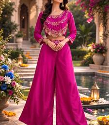 | Product Description | Vibrant Rani Pink Embroidered Crop Top With Flared Palazzo Pants. Designed For Modern Festive Styling, Ideal For Wedding Parties And Pre Wedding Events. |