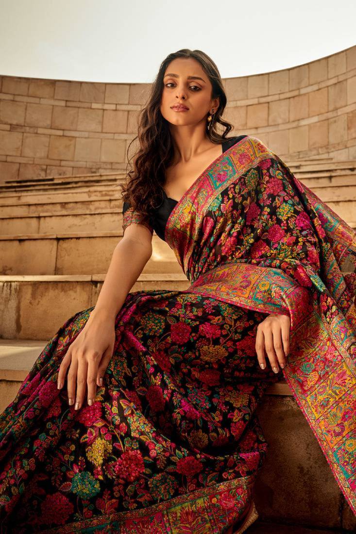 | Product Description | Redefine Classic Luxury With This Stunning Raven Black Silk Blend Saree. The Dark Base Beautifully Amplifies The Vivid Pink, Turquoise, And Gold Floral Motifs Throughout The Body. Detailed With A Wide, Traditional Meenakari Style Border And A Contrasting Pink Pallu, This Saree Is Designed For Those Who Seek High Contrast, High Impact Festive Fashion. |
