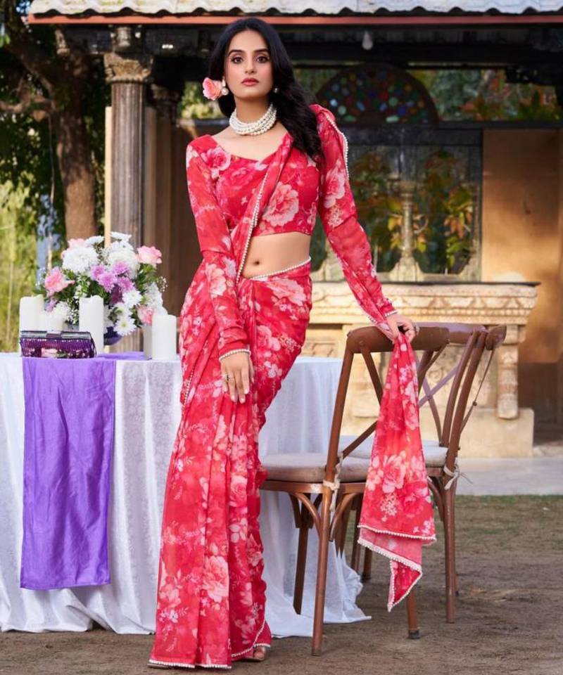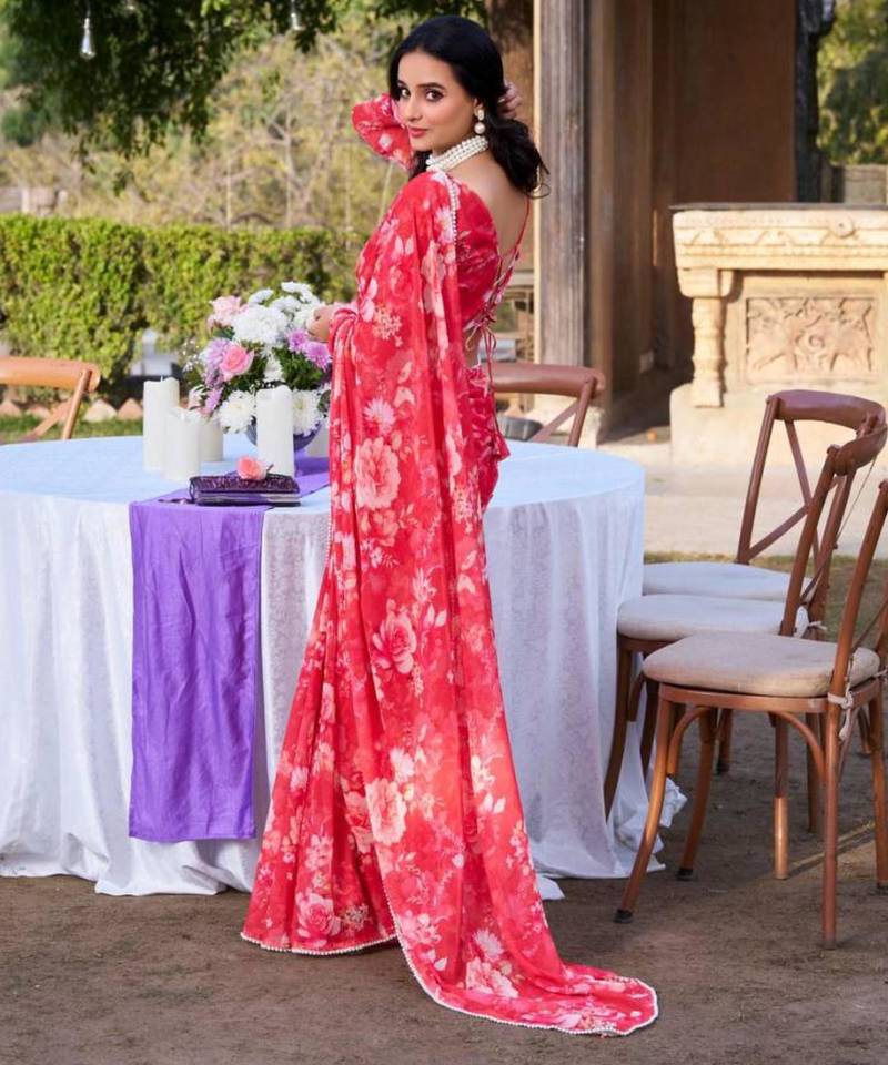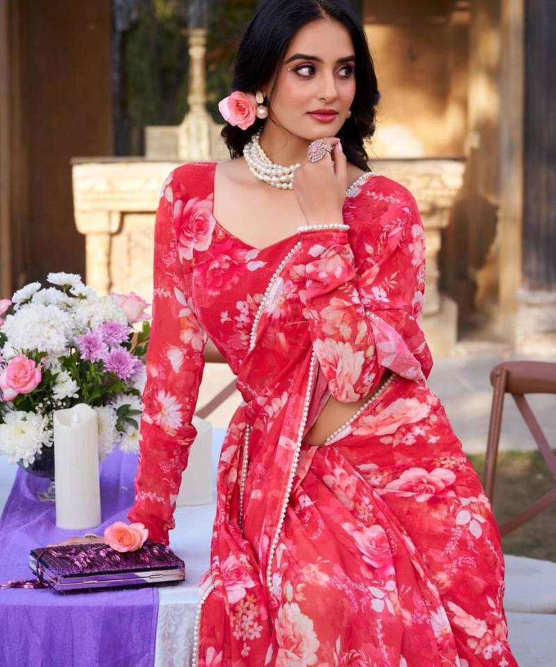 Radiate Romance In This Vibrant Red Georgette Saree Featuring A Lush, Oversized Floral Print. The Lightweight, Breathable Fabric Ensures All Day Comfort, While The Delicate Pearl Beaded Border Adds A Touch Of Classic Refinement. Completed With A Full Sleeved Floral Blouse, It Is A Stunning Choice For Festive Daytime Gatherings