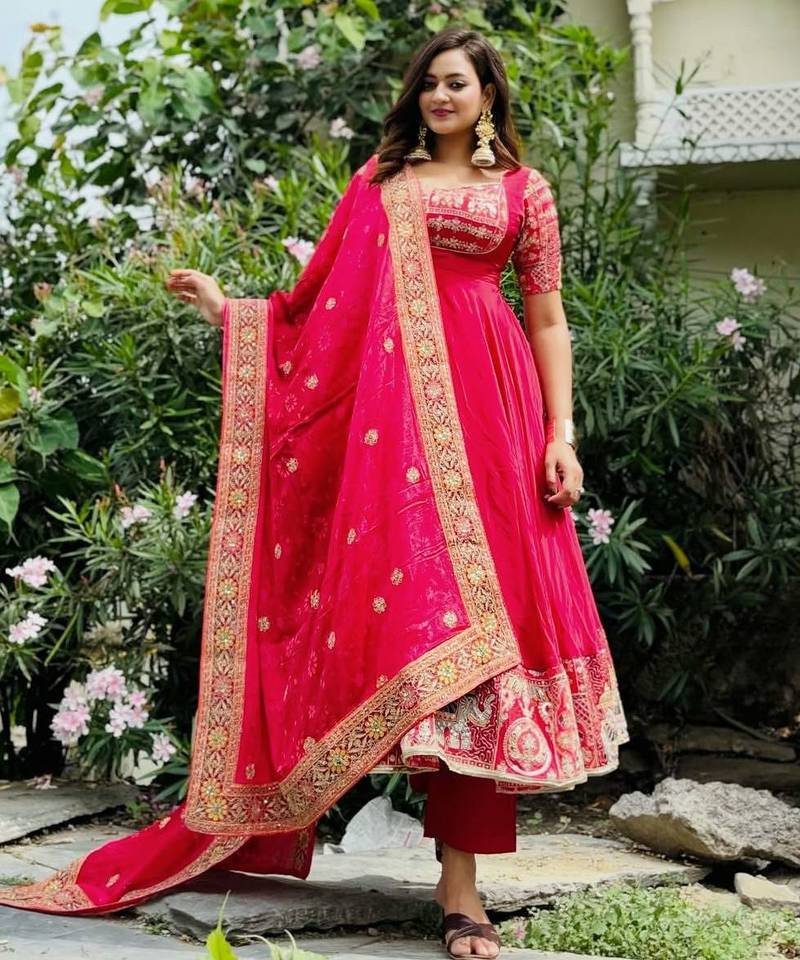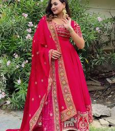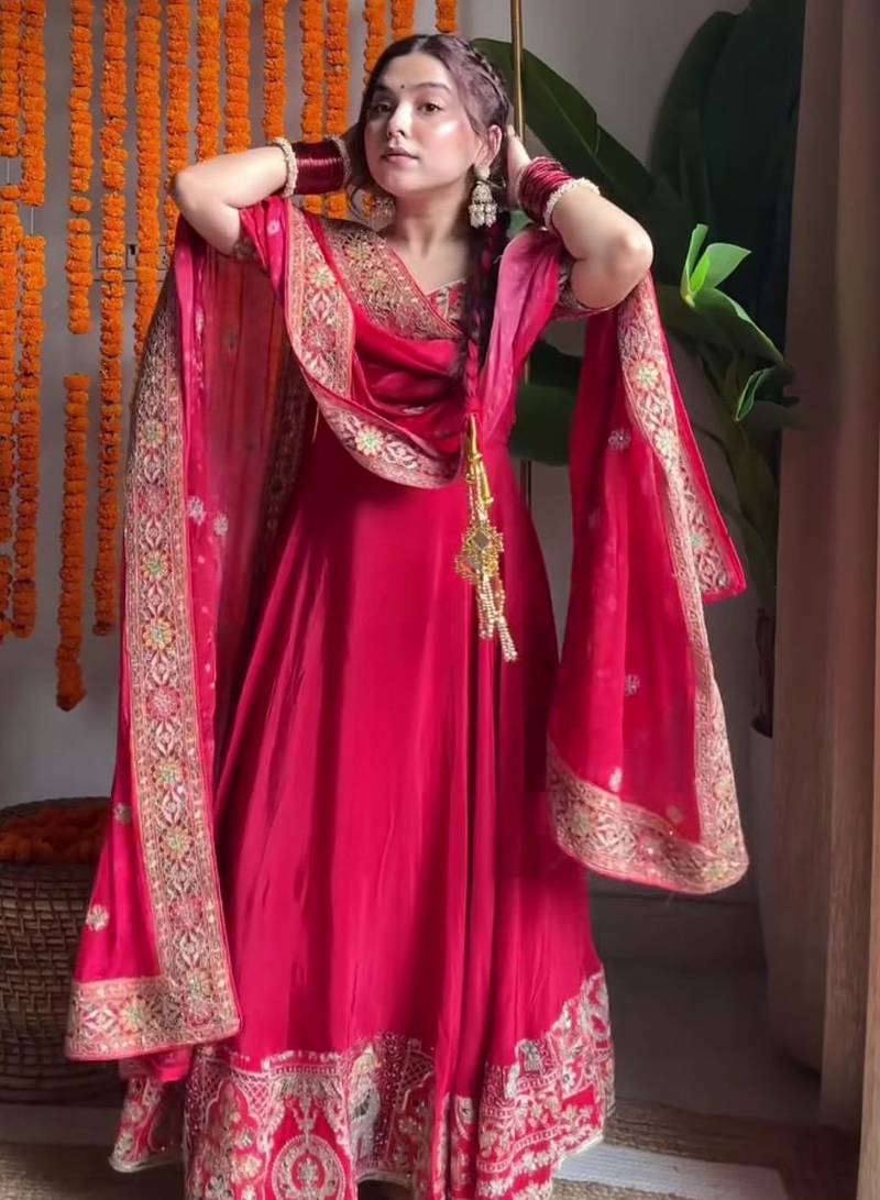 | Product Description | Make A Bold Statement In This Fuschia Red Silk Blend Anarkali. Featuring A Majestic Floor Length Flare, The Hem Is Decorated With Traditional Elephant Motifs And Intricate Gota Patti Work. The Matching Dupatta Adds A Layer Of Luxury, Making This A Perfect Choice For Grand Weddings And High Fashion Editorial Moments. |