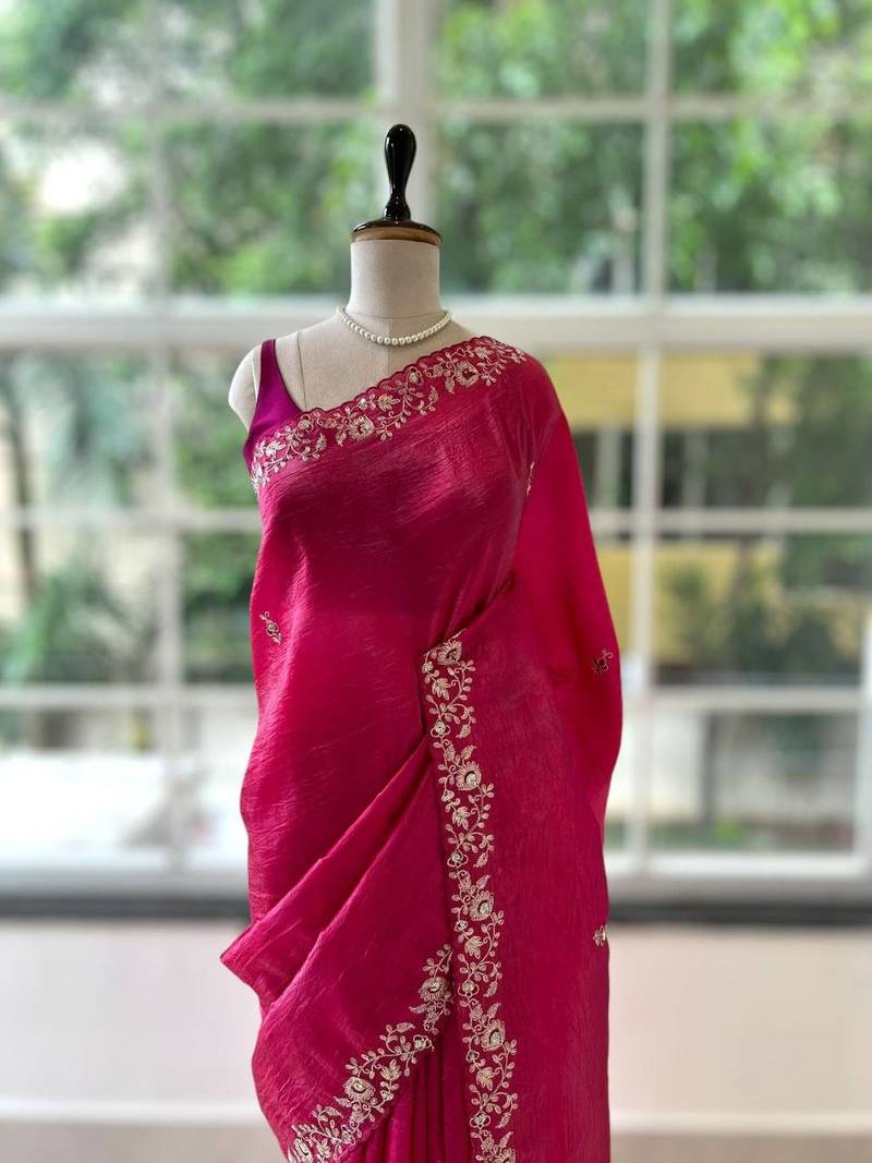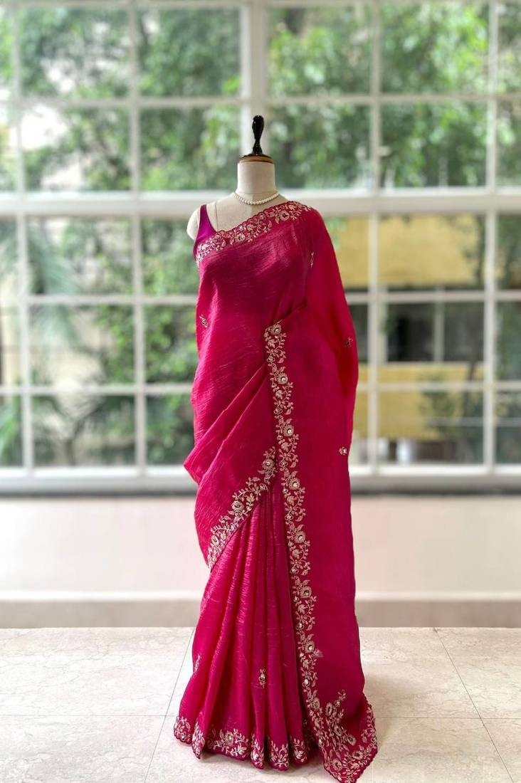 | Product Description | Command Attention In This Striking Red Luminous Saree, Meticulously Crafted To Elevate Your Evening Attire. Featuring A Breathtaking Silver Floral Embroidered Scalloped Border, This Radiant Silk Blend Drape Exudes Opulent Sophistication. Its Flawless Fluid Movement And Brilliant Hue Make It An Indispensable Masterpiece For High Profile Weddings And Glamorous Festive Occasions. |