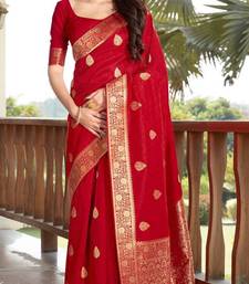 Red woven banarasi silk blend saree with blouse
