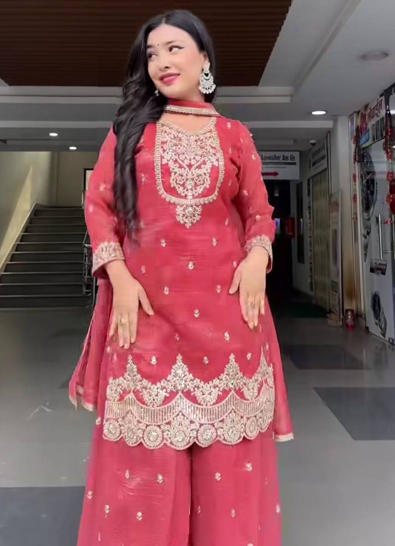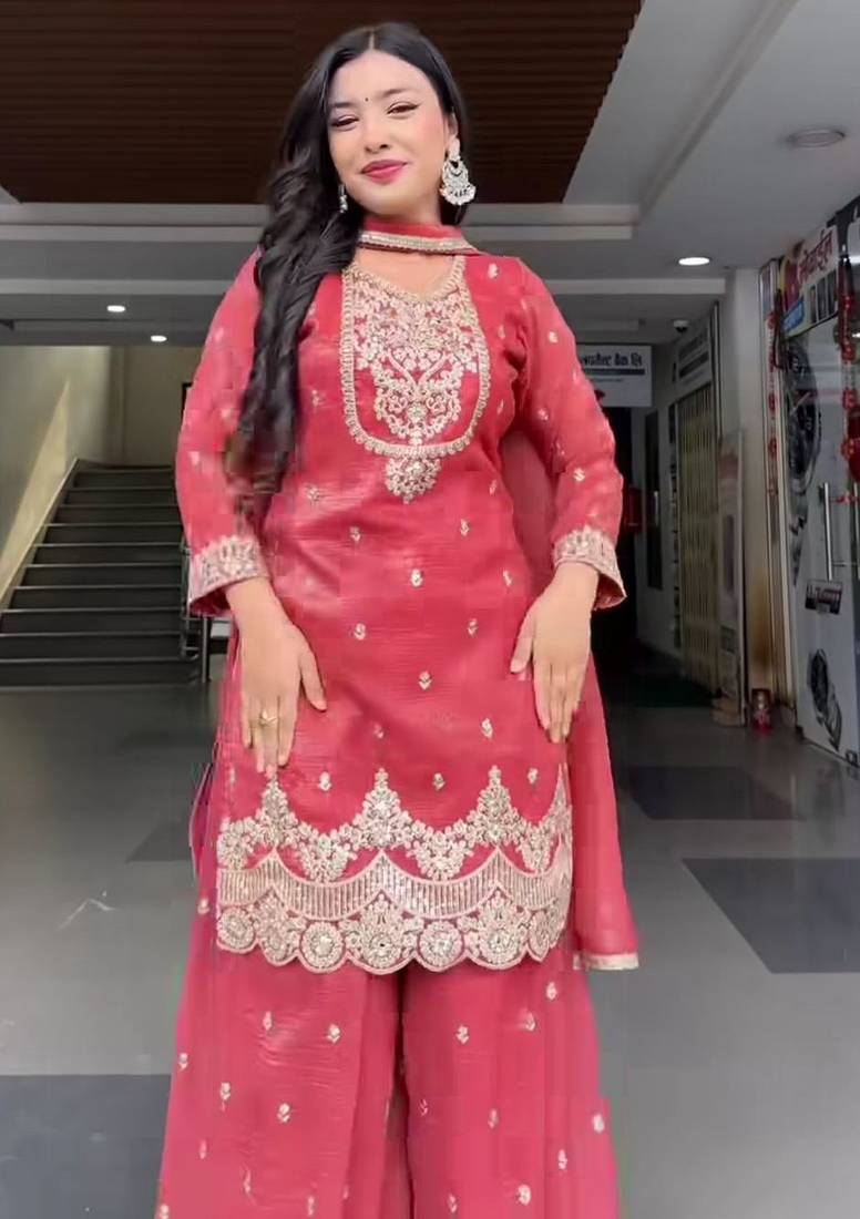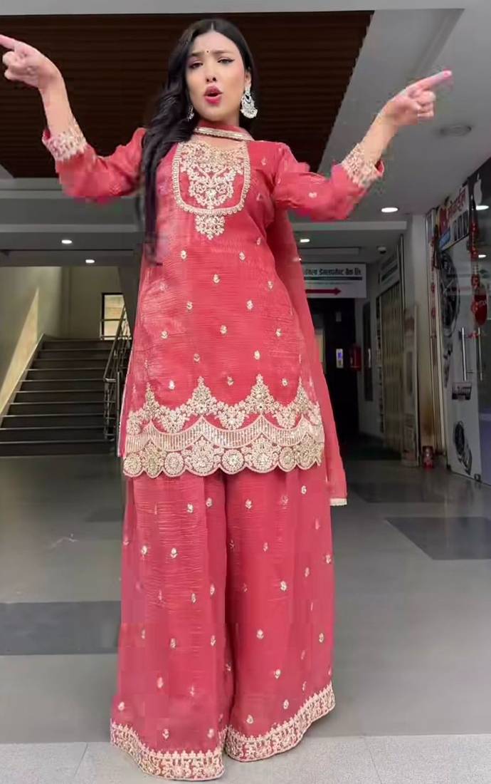 | Product Description | Capture The Essence Of Tradition In This Coral Red Silk Blend Set. The Kurta Features A Heavily Embroidered Neckline And A Wide Zari Work Border At The Hem. Paired With Matching Sharara Pants And A Soft Dupatta, This Look Is Designed For Those Who Appreciate Classic Indian Silhouettes And Opulent, Festive Detailing. |