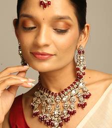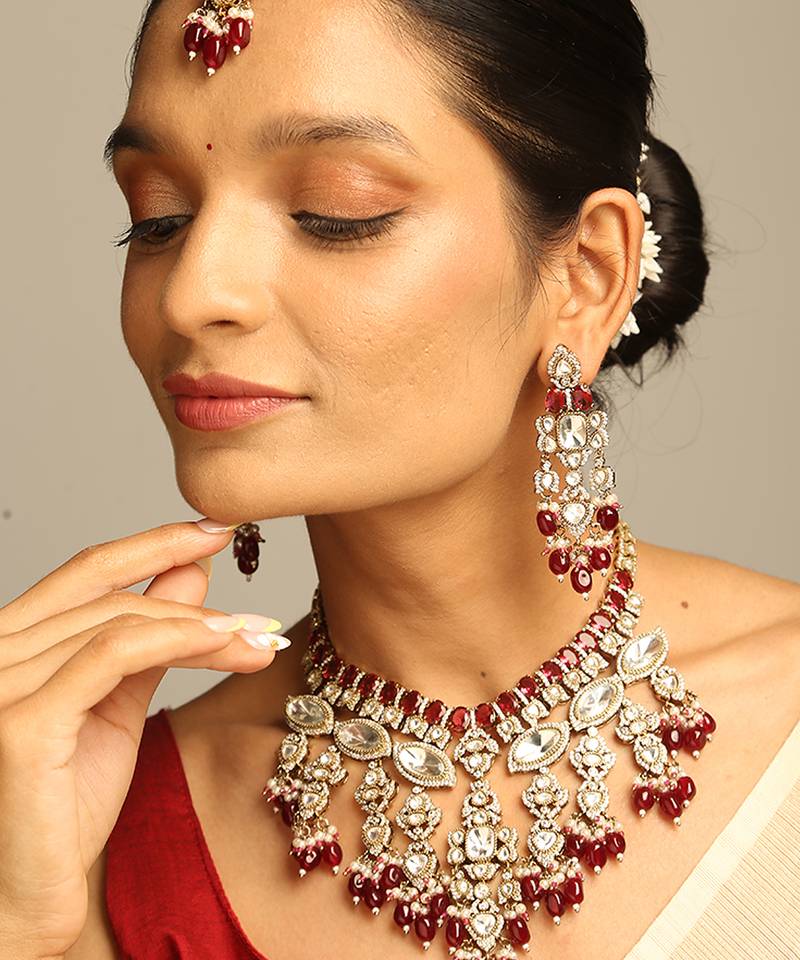 | Product Description | Command Attention With This Grand Bridal Necklace Set, Featuring A Symphony Of Rubies And Polki Work. The Elaborate Bib Style Design Is Accented By Rich Ruby Beads And Intricate Maang Tikka, Offering A Complete Royal Makeover. Designed For The Quintessential Indian Bride, It Embodies Luxury, Heritage, And Unmatched Craftsmanship. |
