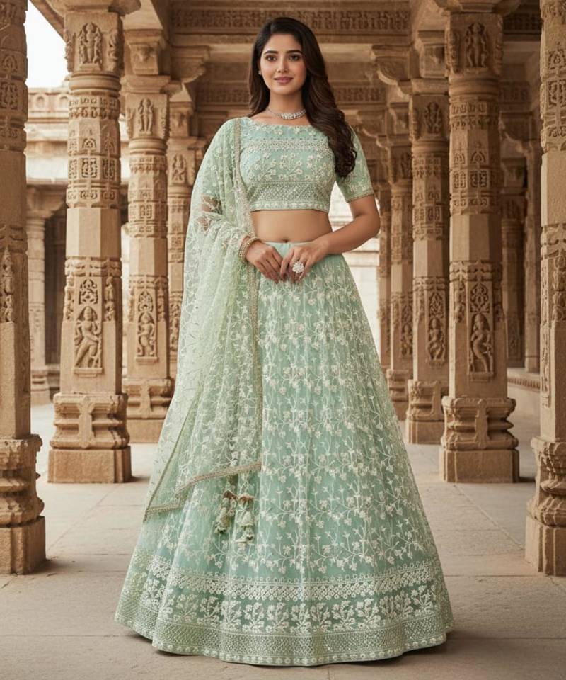 | Product Description | Capture A Fairy Tale Aesthetic With This Mint Green Net Lehenga. The Entire Ensemble Is Layered With Delicate White Floral Embroidery And Fine Lace Detailing For A Romantic, Ethereal Finish. A Heavily Embellished Border And A Coordinating Sheer Dupatta Add The Final Touch Of Luxury, Making This The Perfect Choice For High End Celebrations. |
