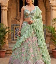 | Product Description | Step Into A Floral Fantasy With This Mint Green Lehenga Choli. Meticulously Crafted With Lavender And Pink Floral Embroidery, The Ensemble Is Highlighted By A Scalloped Edge Sweetheart Blouse. Paired With A Lightweight Ruffled Net Dupatta, This Airy Ensemble Is Ideal For Spring Garden Weddings And High End Pre Wedding Rituals. |