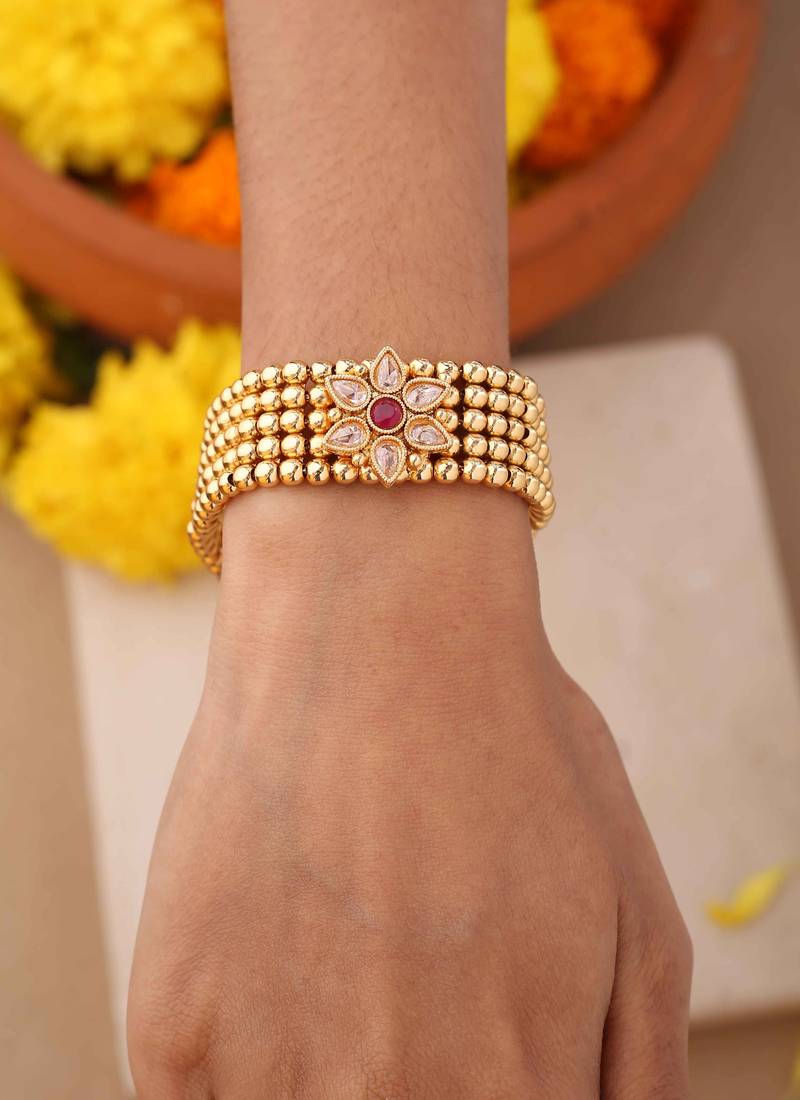 | Product Description | Elevate Your Wrist With The Exquisite Beauty Of Our Floral Radiance Bracelet. Crafted From Durable Alloy And Adorned With Intricate Kundan Work, This Bracelet Features A Captivating Flower Motif At Its Center. The Radiant Gold Hue Exudes Opulence And Sophistication, Making It The Perfect Accessory For Both Festive Celebrations And Contemporary Occasions. |