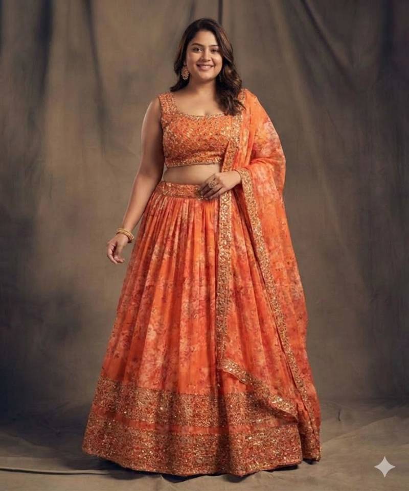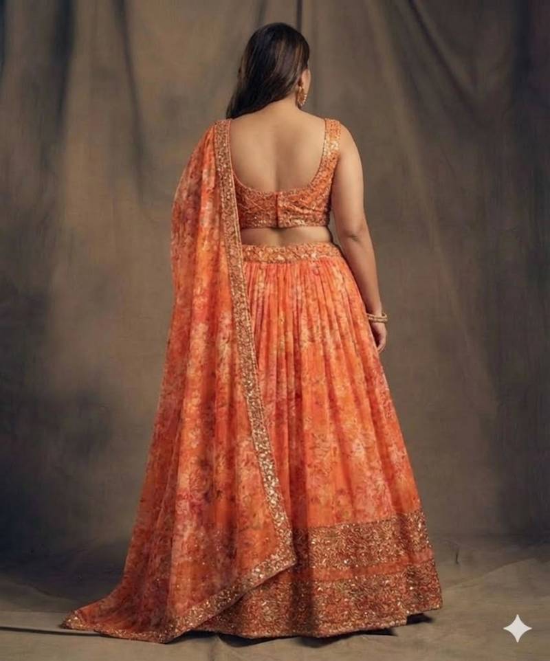| Product Description | Elevate Your Style By Adorning This Ornamental Orange Lehenga Choli. Made With Ethereal Organza Fabric, This Outfit Is Crisp, Delicate And Lightweight To Carry Around. This Organza Lehenga Set Consists Of A Circular Lehenga, A Choli And A Flowy Dupatta. It Features Intricate Zari Work Embroidery Along With Elegant Floral Prints, Making This Lehenga Choli Feel Like The One Straight Out Of A Dream. This Floral Lehenga Choli Is A Perfect For Weddings, Engagements, Guest Events And Festive Occasions.