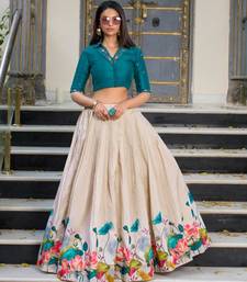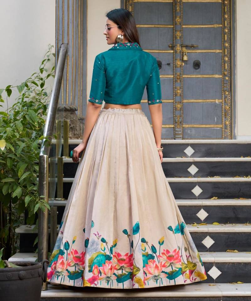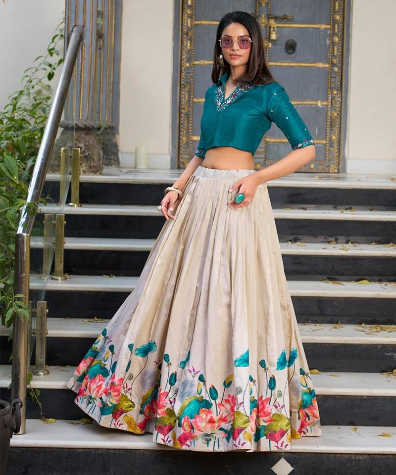 | Product Description | This Modern Lehenga Set Features A Stylish Teal Blouse Paired With A Beige Skirt Adorned With Floral Prints. Designed For Comfort And Contemporary Appeal, It Is Perfect For Festive Events Or Casual Celebrations. Lightweight And Elegant, This Outfit Offers A Fresh Take On Traditional Ethnic Fashion. |
