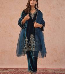 Teal blue velvet kurta set with intricate embroidery work stitched