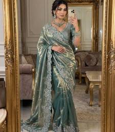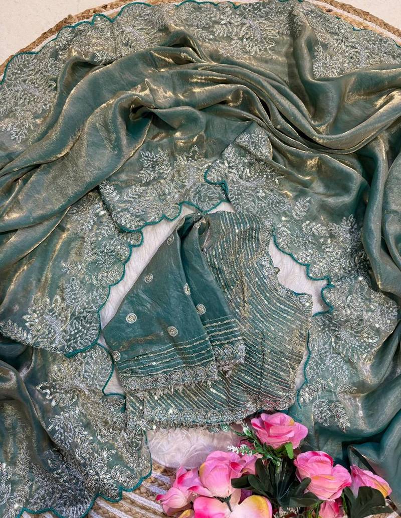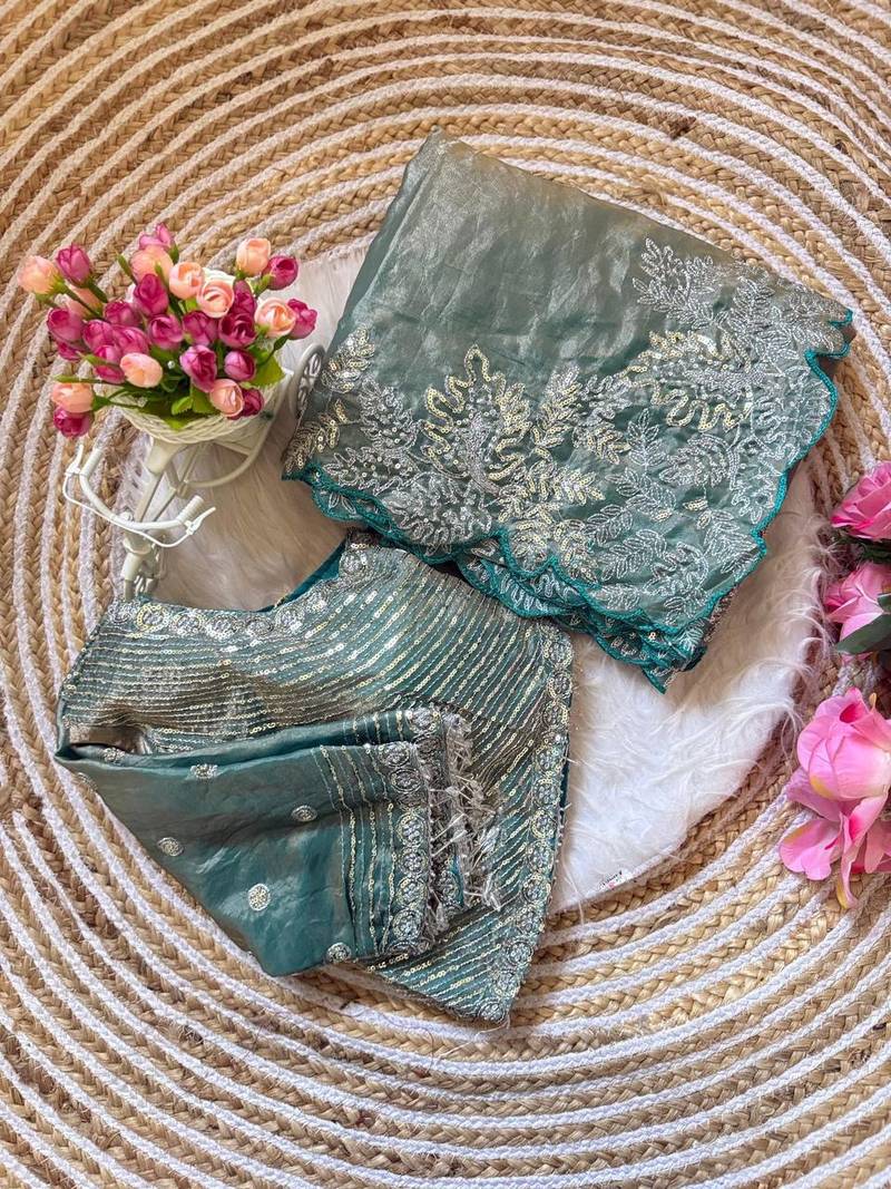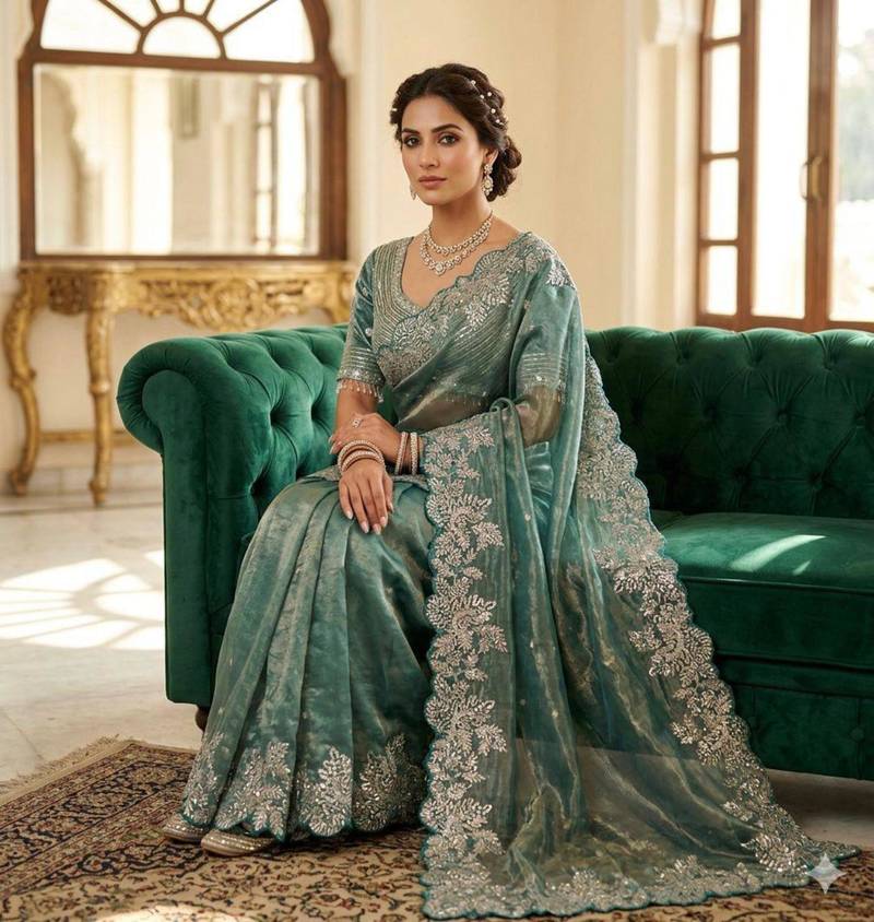 | Product Description | Command Attention In This Spectacular Teal Tissue Silk Saree, Radiating An Ethereal, Luminous Glow. Masterfully Framed By An Elaborate Scalloped Border Featuring Dense Silver Floral Embroidery, This Luxurious Garment Offers An Impeccably Refined Aesthetic. Ideal For Opulent Receptions And Formal Galas, It Epitomizes Graceful Femininity And Exquisite Traditional Craftsmanship. |
