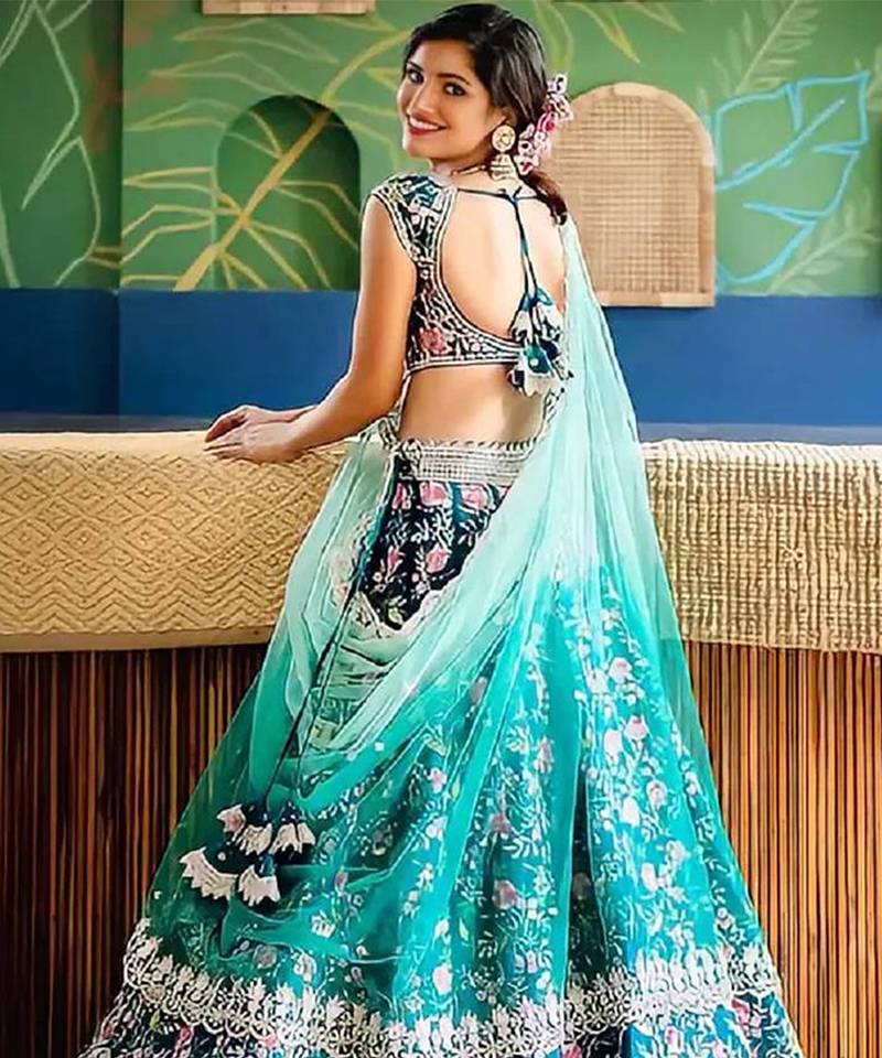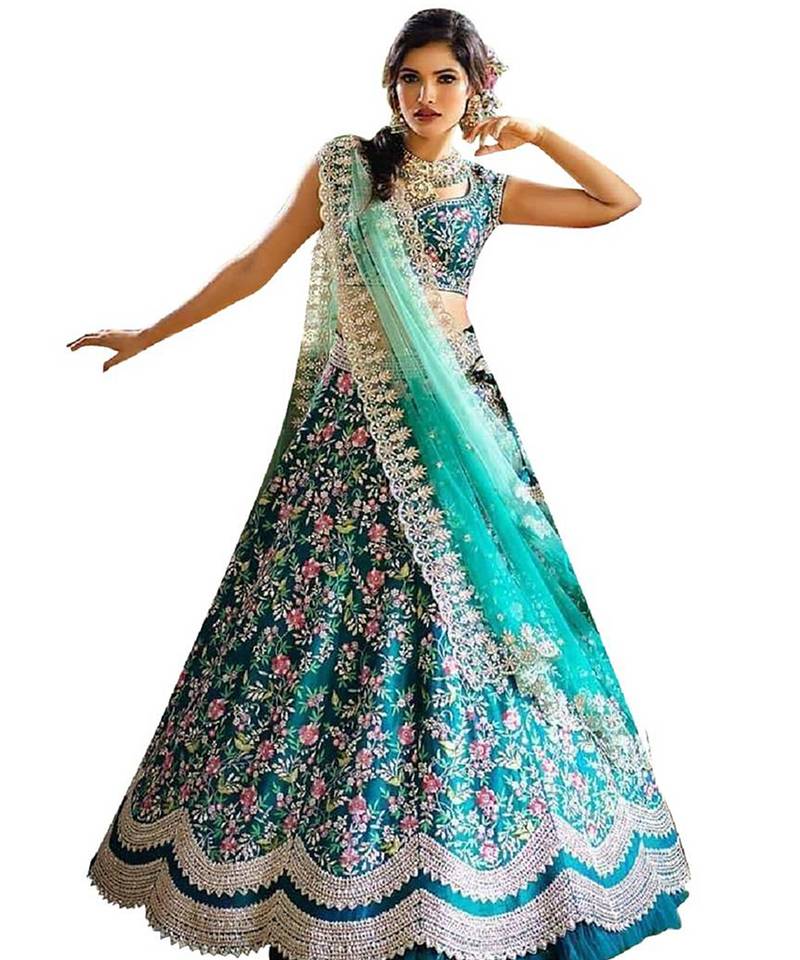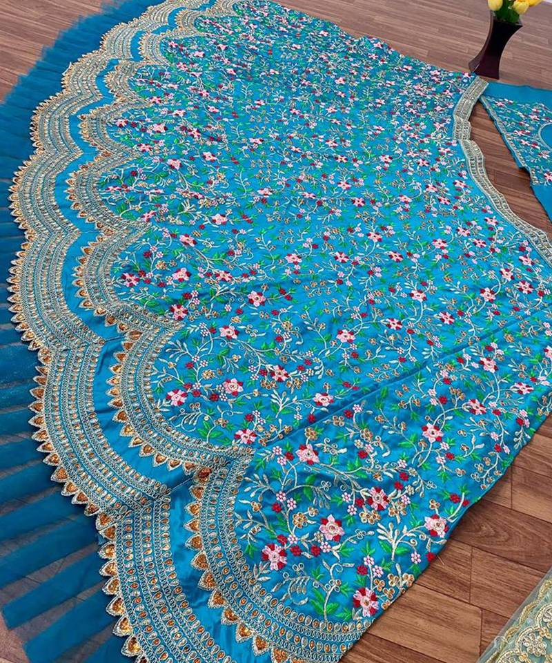 Turquoise satin embroidery work lehenga choli with dupatta