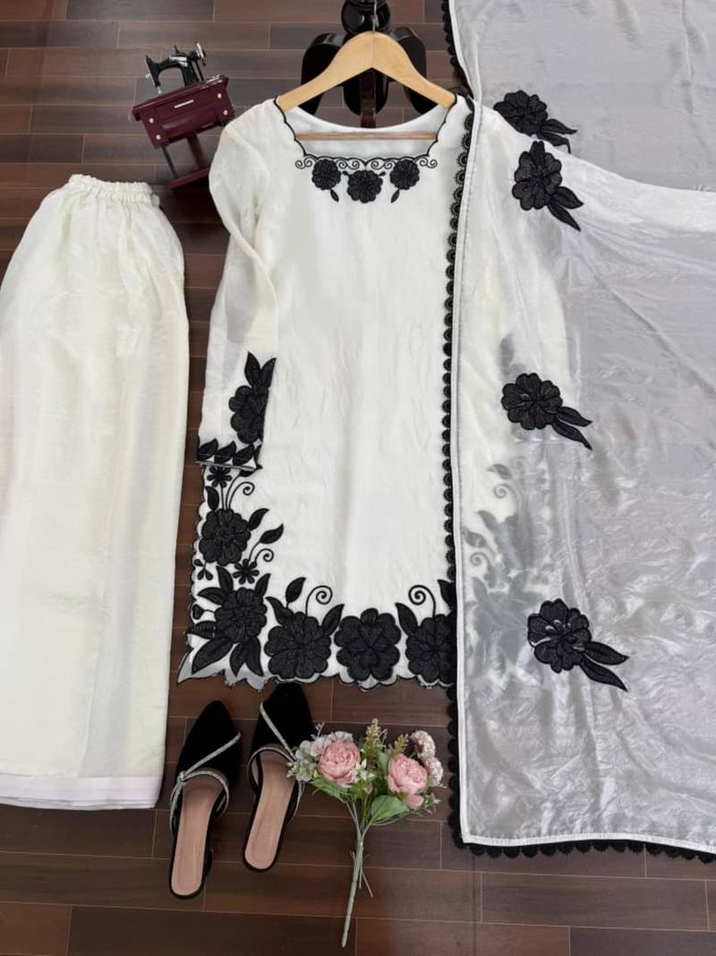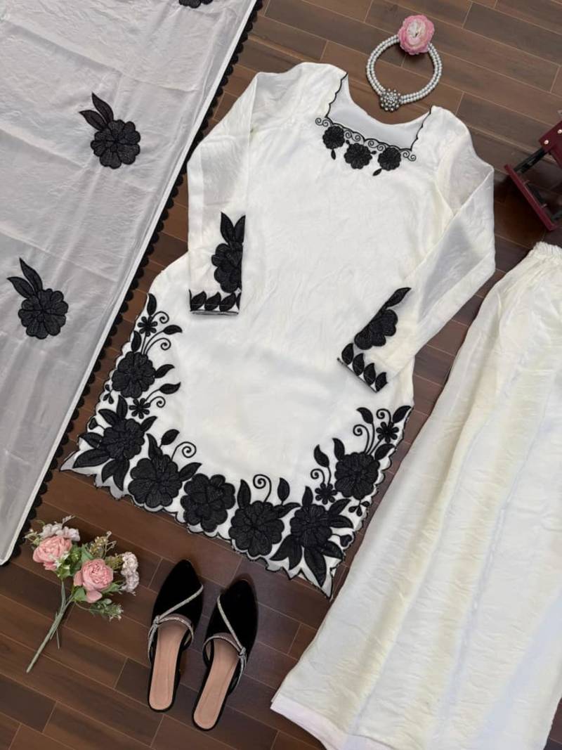 | Product Description | Elevate Your Ethnic Wardrobe With This Sophisticated White Silk Blend Kurta Set. Featuring Striking Black Floral Embroidery Along The Hem And Sleeves, This Ensemble Offers A Timeless Monochrome Aesthetic. The Lightweight Fabric Ensures Comfort, While The Coordinating Dupatta With Matching Motifs Provides A Polished Finish For Festive Gatherings Or Formal Occasions. |