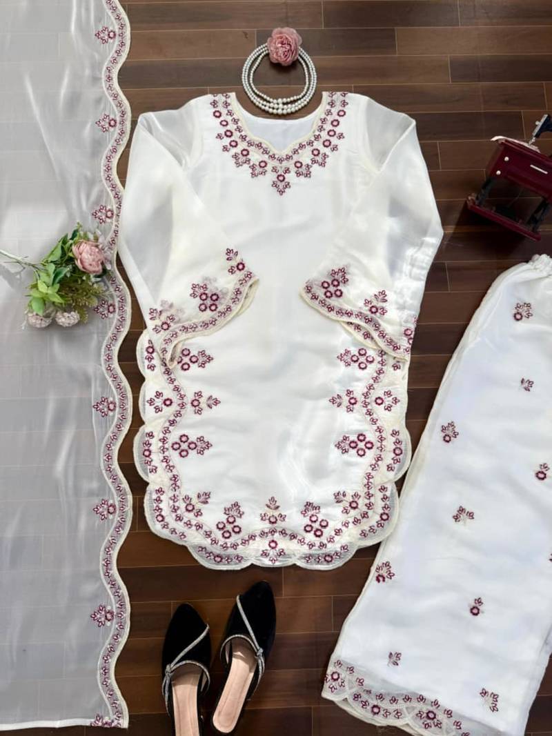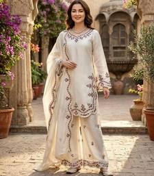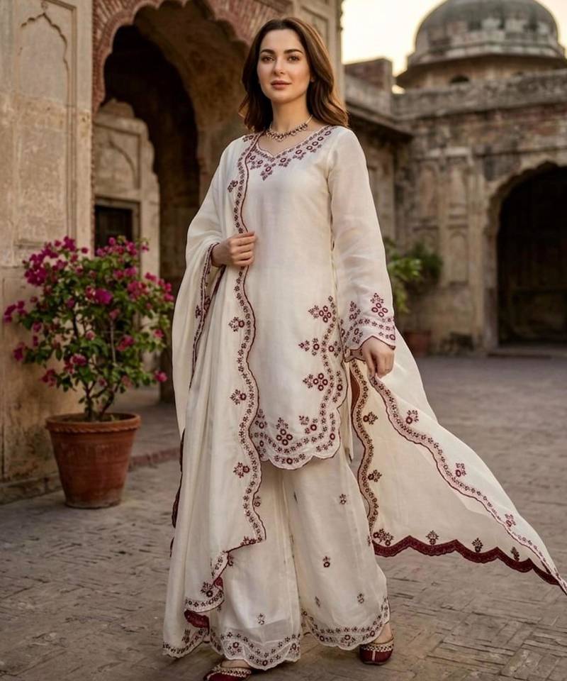 | Product Description | This White Ensemble Exudes Timeless Sophistication. The Straight Cut Tunic Is Adorned With Intricate Maroon Threadwork Along The Neckline And Sleeves. Paired With Comfortable Wide Leg Palazzo Pants And An Embroidered Dupatta, This Silk Blend Suit Is A Premium Choice For Formal Gatherings, Offering A Look Of Understated Luxury. |