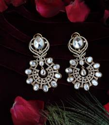 | Product Description | Discover Timeless Beauty With These Handcrafted Kundan Style Drop Earrings. Featuring A Unique Openwork Design Studded With Brilliant White Stones In A Radiant Gold Setting, These Earrings Blend Traditional Artistry With Modern Flair. Their Versatile Size Makes Them A Must Have Accessory For Diwali Celebrations, Bollywood Parties, Or Formal Dinners. |