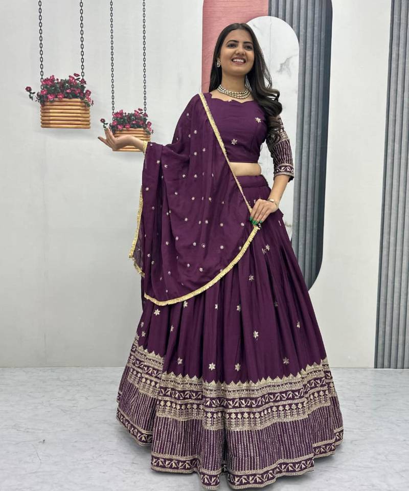| Product Description | Elevate Your Festive Wardrobe With This Majestic Deep Wine Lehenga Choli. Crafted From Premium Georgette, It Features A Scalloped Neck Blouse Adorned With Ornate Golden Zari Work On The Sleeves. The Matching Pleated Skirt And Gold Bordered Dupatta Create A Balanced, Regal Silhouette Perfect For Evening Receptions And High End Wedding Free Size Upto 44 Festivities. |