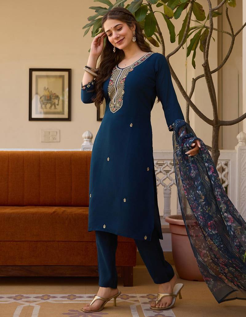 | Product Description | Enhance Your Ethnic Collection With This Stunning Dark Blue Kurta Set. The Straight Fit Tunic Features A Meticulously Embroidered Neckline And Delicate Sleeve Accents. Paired With Tonal Trousers And A Breathtaking Organza Dupatta Boasting Vibrant Floral Prints, This Ensemble Offers A Perfect Balance Of Traditional Craftsmanship And Modern Aesthetic For Any Festive Occasion |