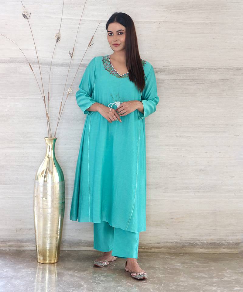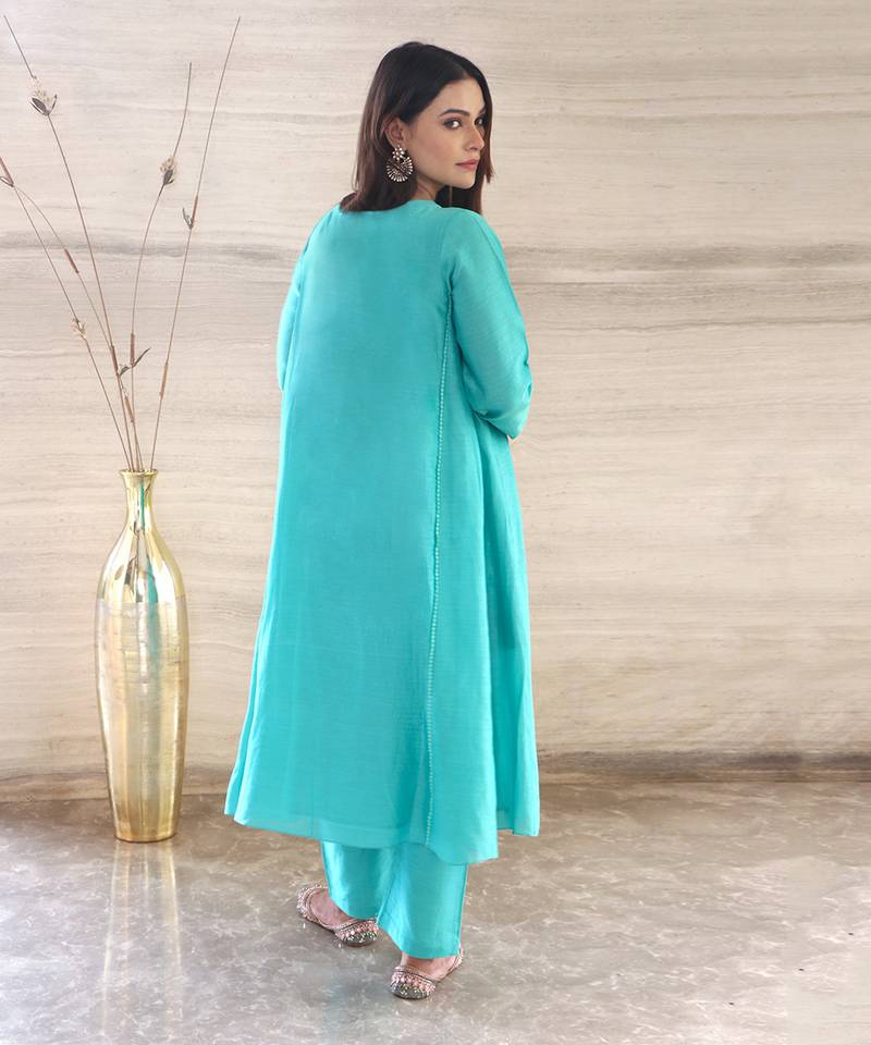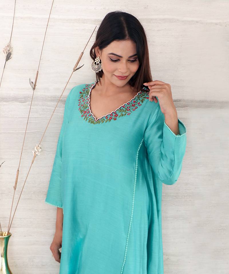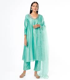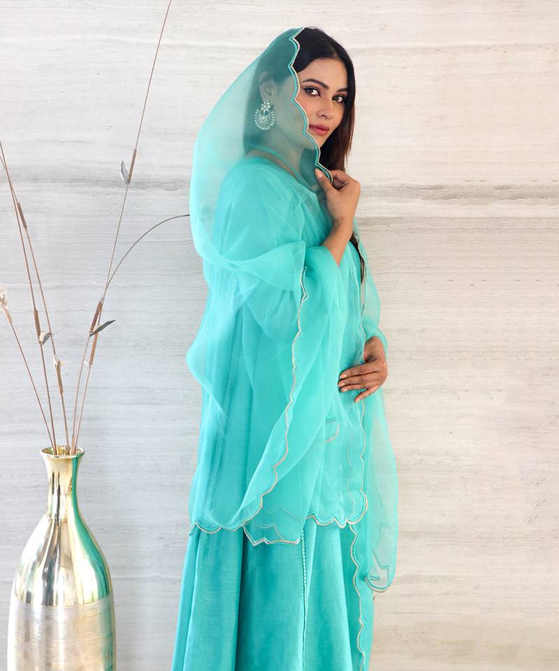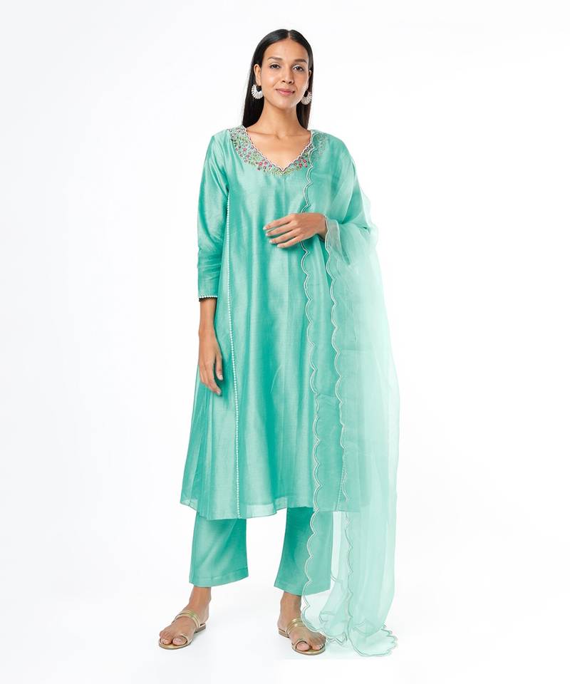 Product Description | This Sea Green Kurta Set Comes With A Buttery Organza Scalloped Dupatta With Beautiful Embroidery On The Neckline With Resham,Zari And Pearls. |