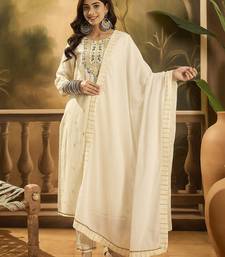 Women solid embroidered cotton kurta with trousers & dupatta