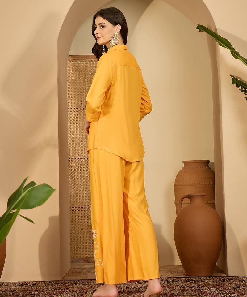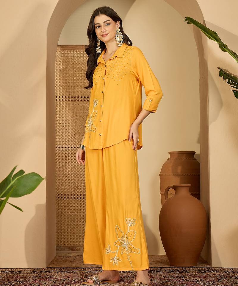 Women yellow embroidered viscose rayon shirt & trousers co-ords