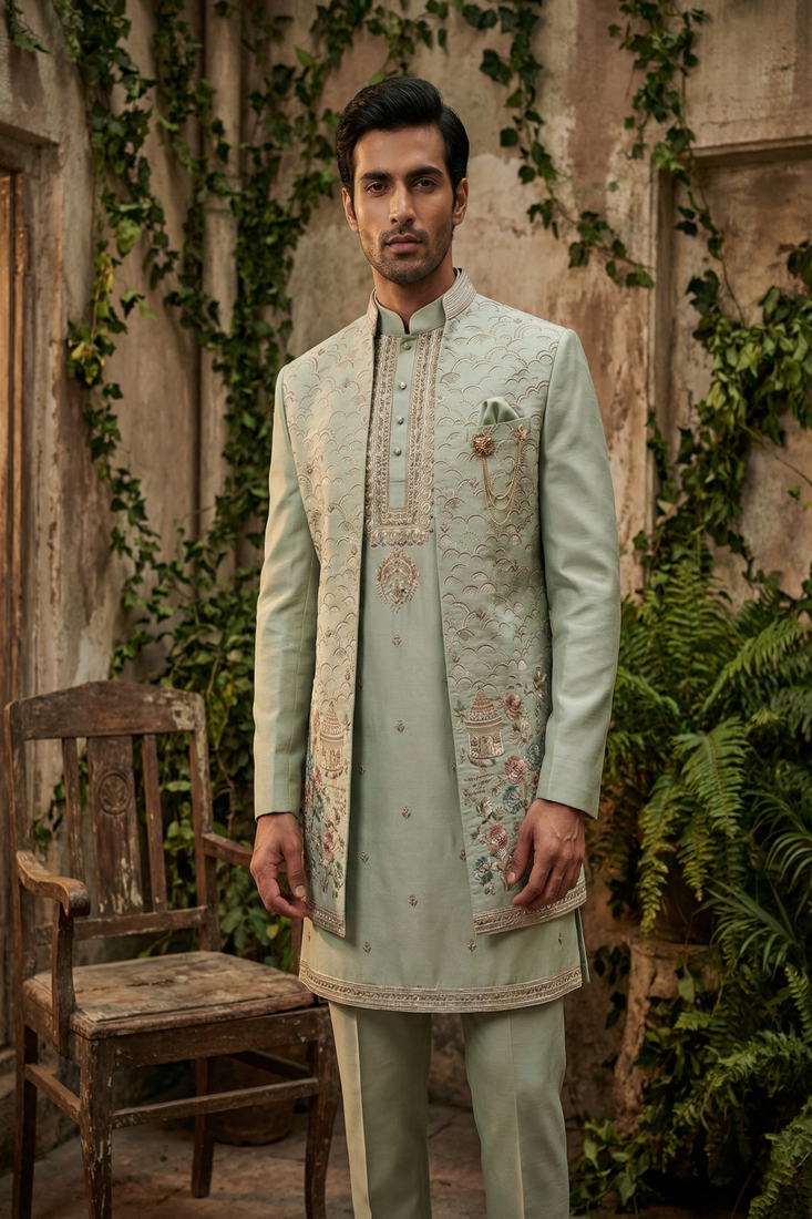 Light green thread and sequins embroidered indowestern
