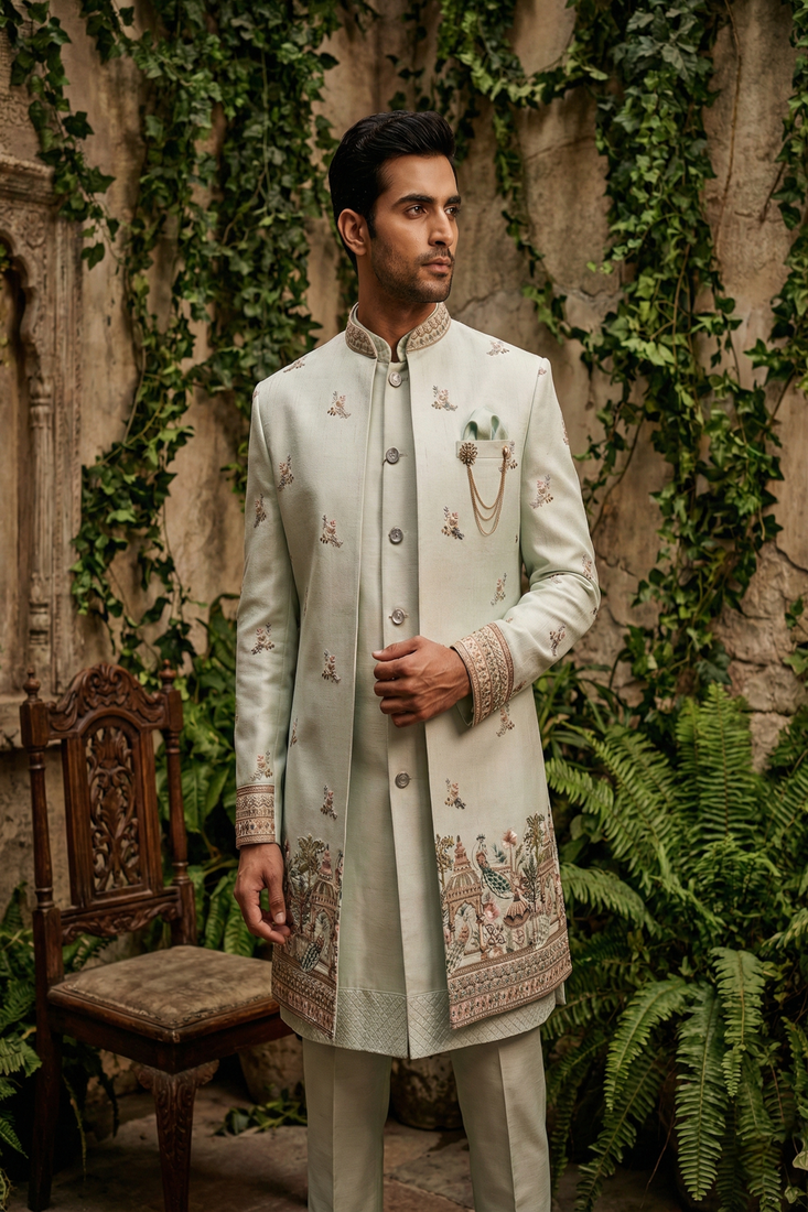 | Product Name | Light Pista Thread And Sequins Embroidered Indowestern | |